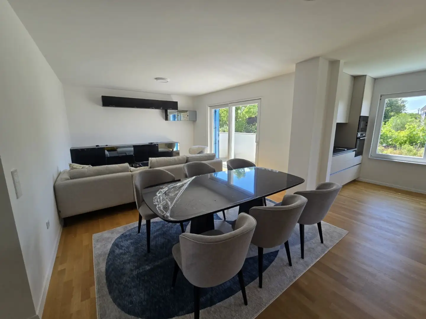 Апартамент на первом этаже имеет полезную площадь 98 м² и включает в себя две спальни, каждая из которых имеет свою ванную комнату, открытую кухню и гостиную с выходом на крытую террасу, а также одну спальню с выходом на террасу. Этот этаж также включает в себя пространство для гардероба и дополнительную ванную комнату, предлагая функциональную и комфортную жилую планировку.