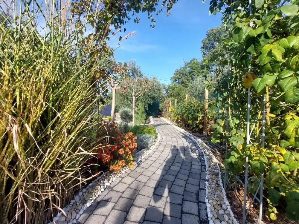 Были посажены различные декоративные растения, а на заднем дворе есть место для строительства бассейна. На заднем дворе есть также вспомогательное здание, которое служит складским помещением. Полив растений капельный. Для ваших оловянных питомцев предусмотрена частная парковка на несколько автомобилей.