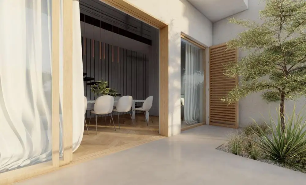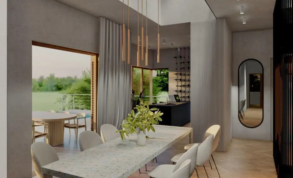 На первом этаже есть гостевые туалеты, кухня со столовой и гостиная с прямым выходом на крытую террасу, в сад и к бассейну.