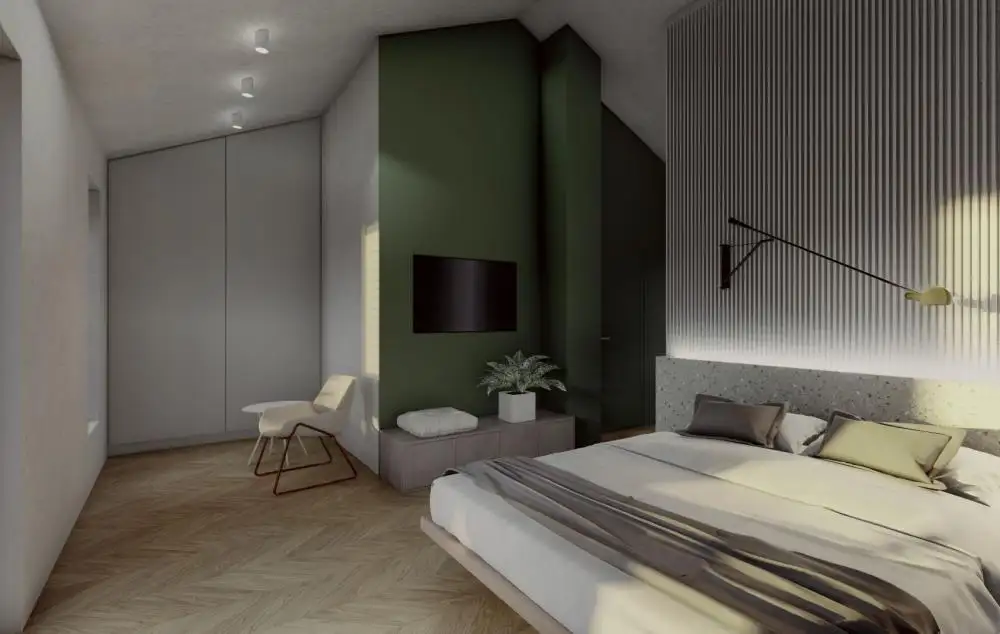Вилла разделена на три этажа, где в подвале находятся гараж, прачечная, машинное отделение, кладовая и одна спальня с гардеробной и ванной комнатой.