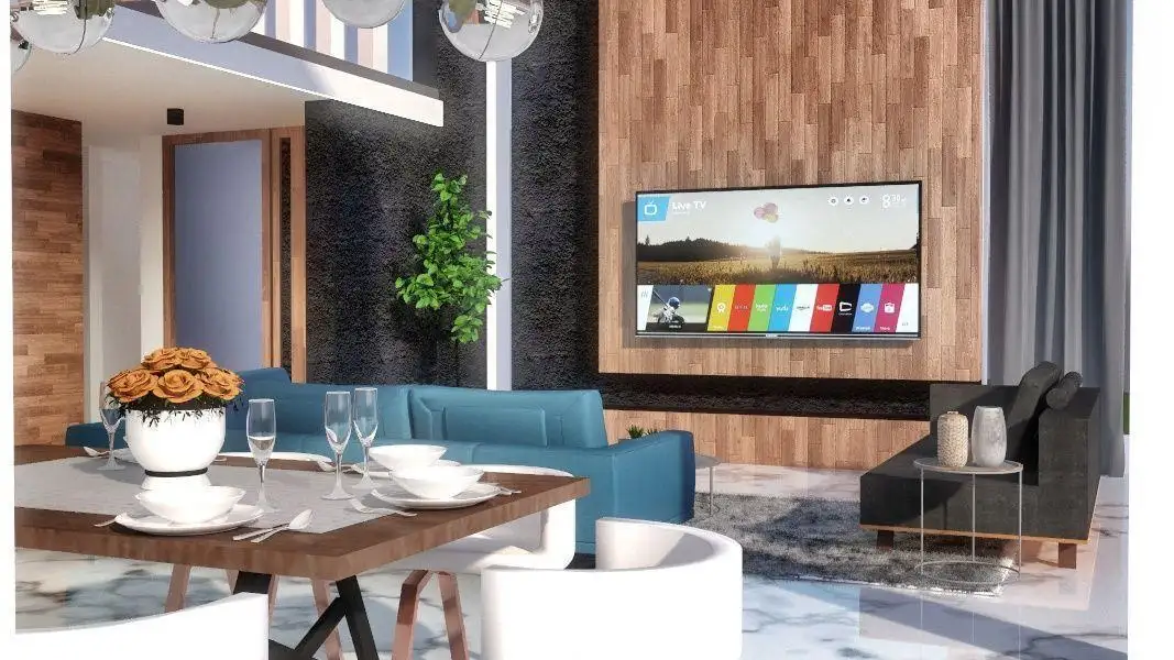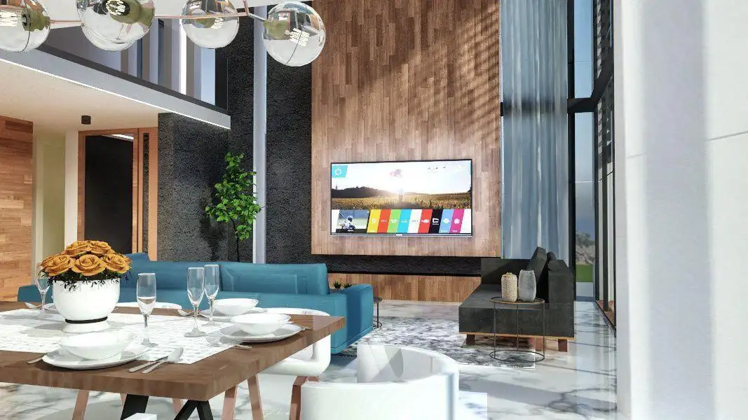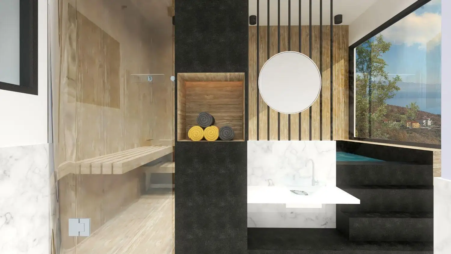 - Первый этаж: просторная гостиная, современная кухня со столовой, гардеробная, коридор, лестница, гостевой туалет, просторная терраса и собственный бассейн.