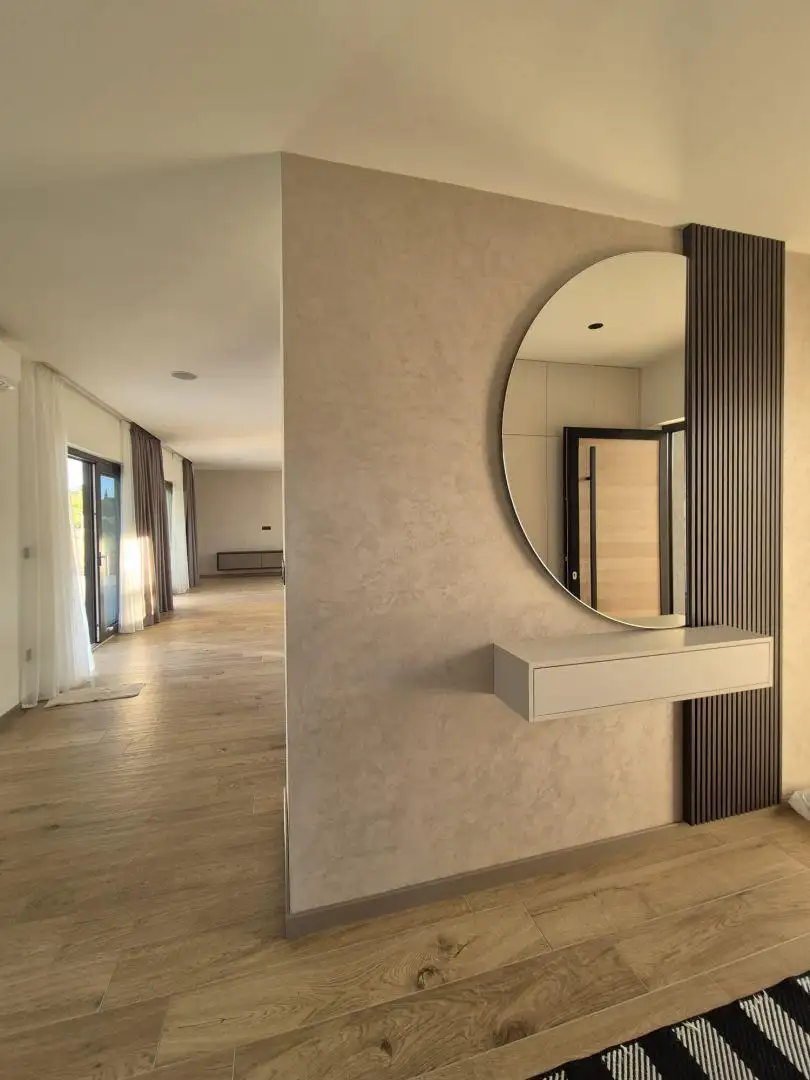 На этой вилле площадью 291 м² каждый квадратный метр продуманно спроектирован для простоты и максимального комфорта. При входе вас встречает элегантный вестибюль со специальной гардеробной, разделяющий виллу на жилую и приватную части.