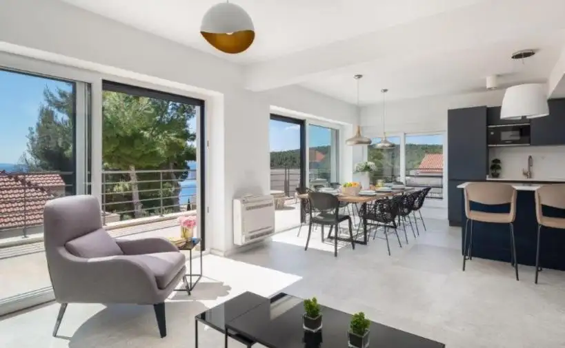 На верхнем этаже расположены две спальни, каждая с собственной ванной комнатой и видом на прекрасный залив Дубока.