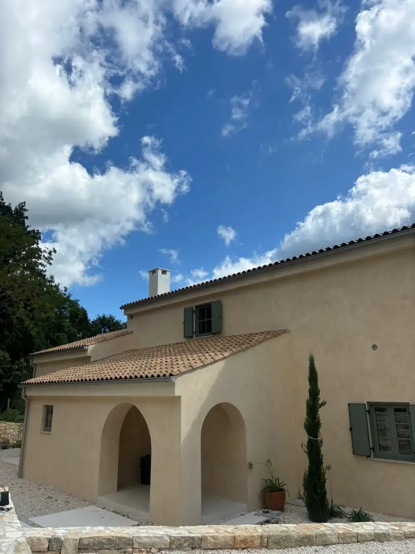 На продажу: Новая вилла в средиземноморском стиле в центральной Истрии, окруженная зеленью и природой, предлагающая абсолютный покой и уединение с открытыми видами и вечным дизайном.