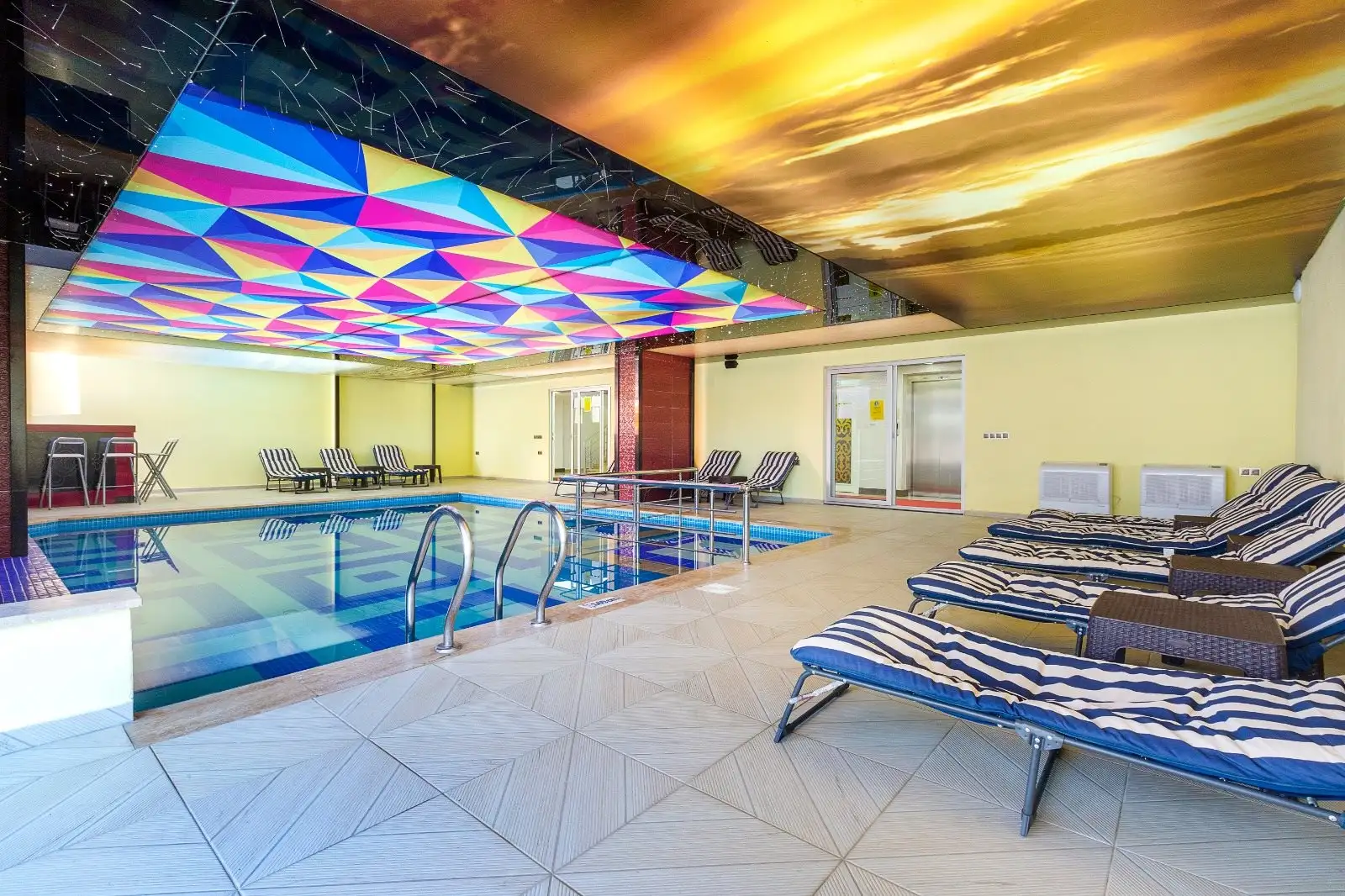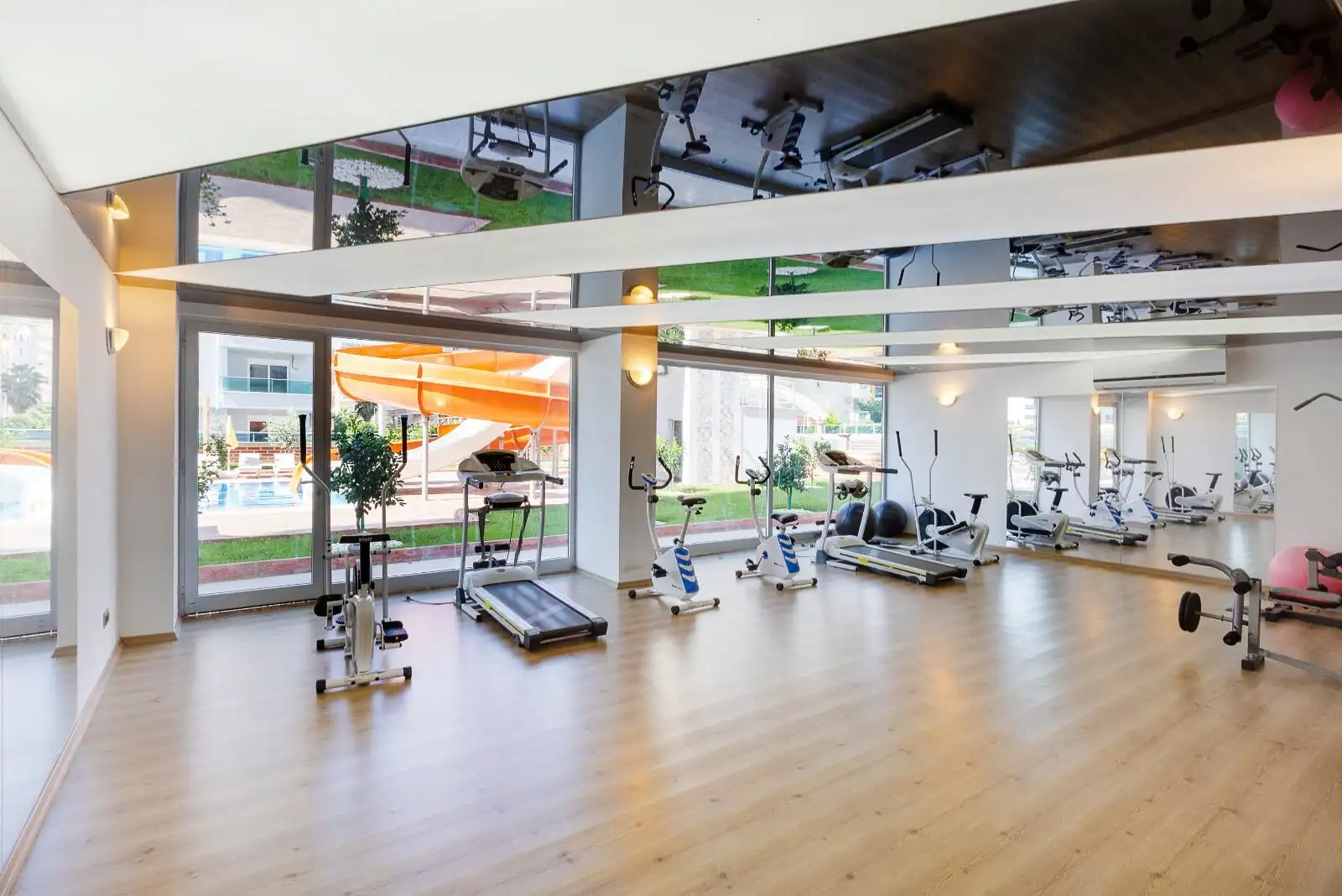 Внутри комплекса: закрытый подогреваемый бассейн, сауна, паровая комната, детская игровая зона, бильярд, настольный теннис, тренажёрный зал.