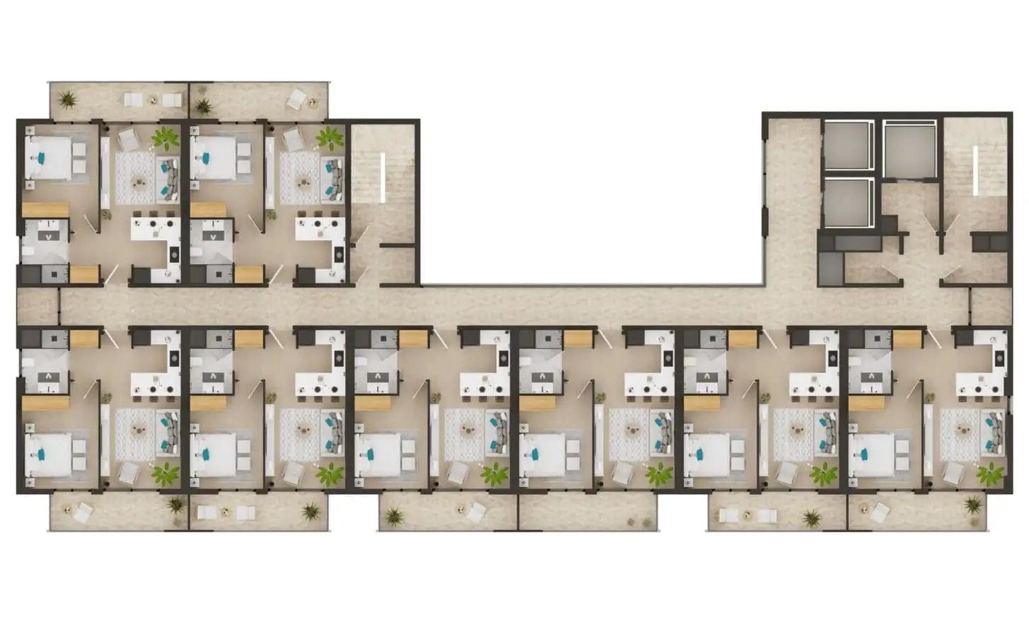 Внутри: Доступны апартаменты планировкой 1+1 площадью от 51,5 м2 до 61,58 м2.