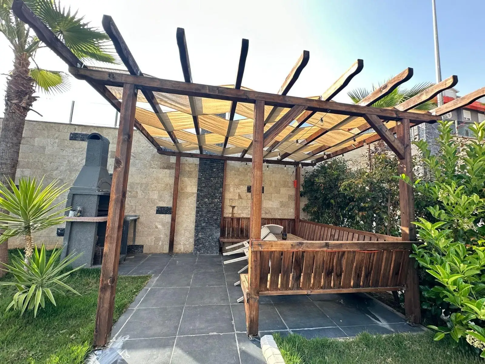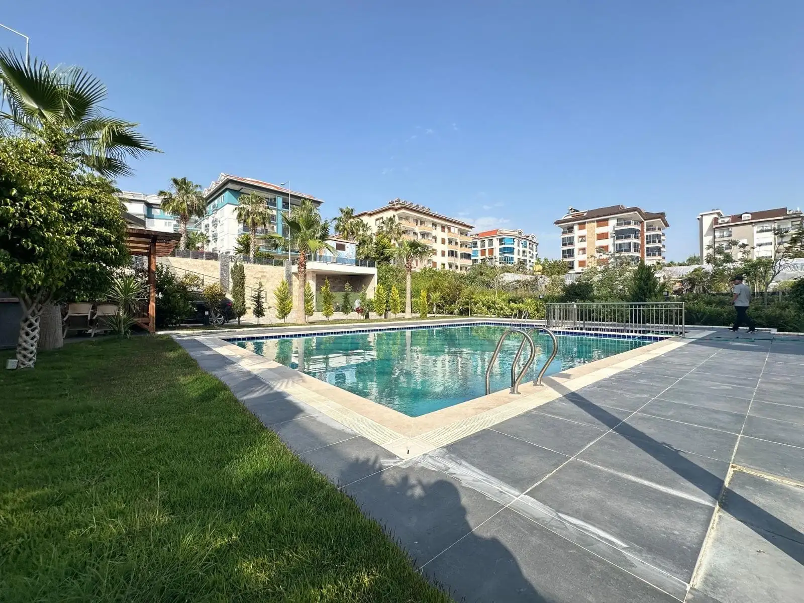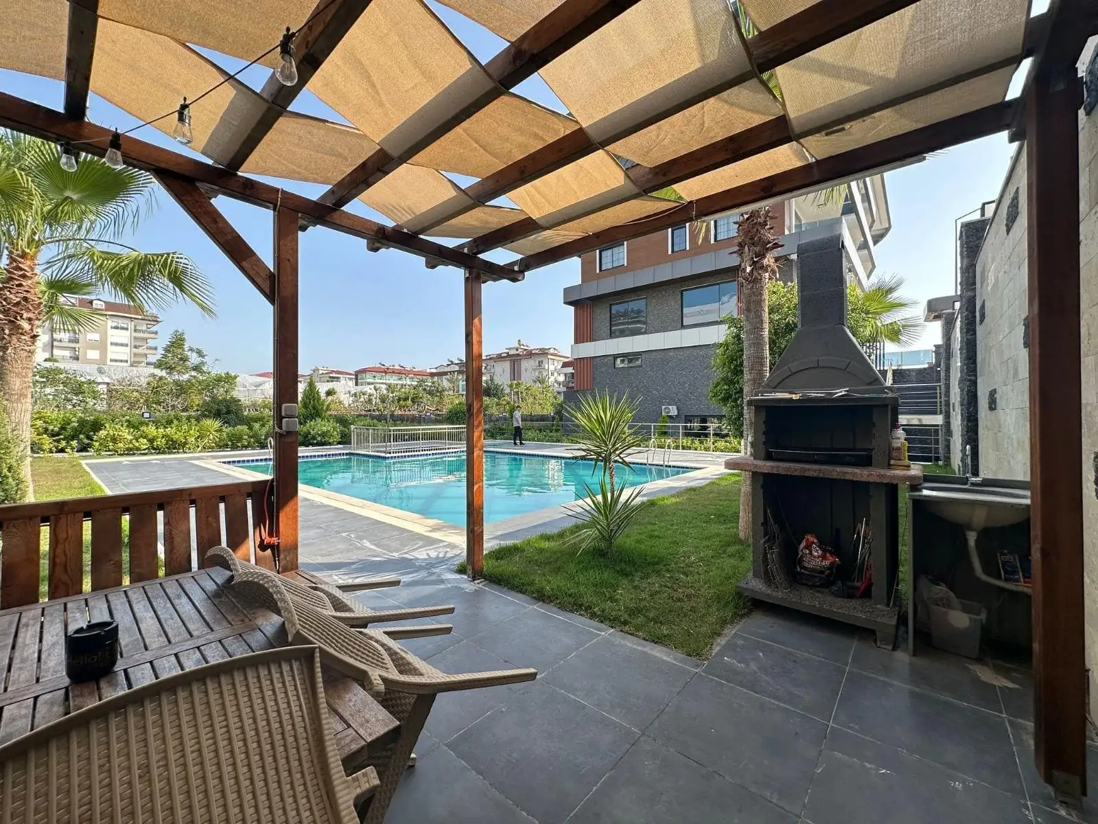 Что в комплексе: Небольшой аккуратный комплекс с ухоженной зелёной территорией и всеми условиями для комфортной жизни: открытый бассейн, хамам, сауна, зона барбекю, генератор, сад, услуги смотрителя. Всё работает и поддерживается в хорошем состоянии.
