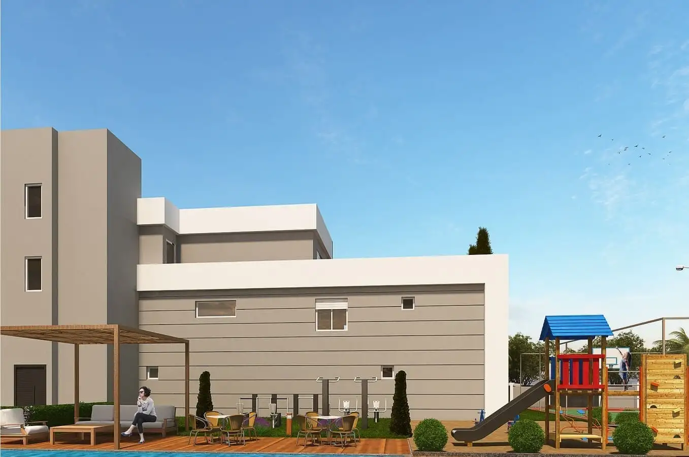 Что в комплексе: На закрытой озелененной территории площадью 2 897,50 м2 будет расположено 3 жилых блока на 40 квартир и 4 магазина. В инфраструктуру комплекса будут входить открытый бассейн, детский бассейн, детская площадка, прогулочные дорожки, баскетбольная площадка, беседки для отдыха, крытый бассейн, хамам, финская сауна, фитнес, открытая парковка, генератор. В комплексе будет установлена система видеонаблюдения; будет работать круглосуточная охрана.