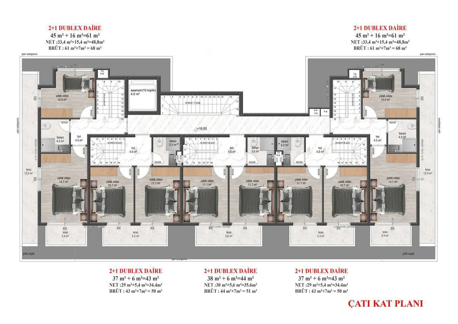 Двухуровневые пентхаусы планировкой 2+1 площадью от 104 до 121 м2.;