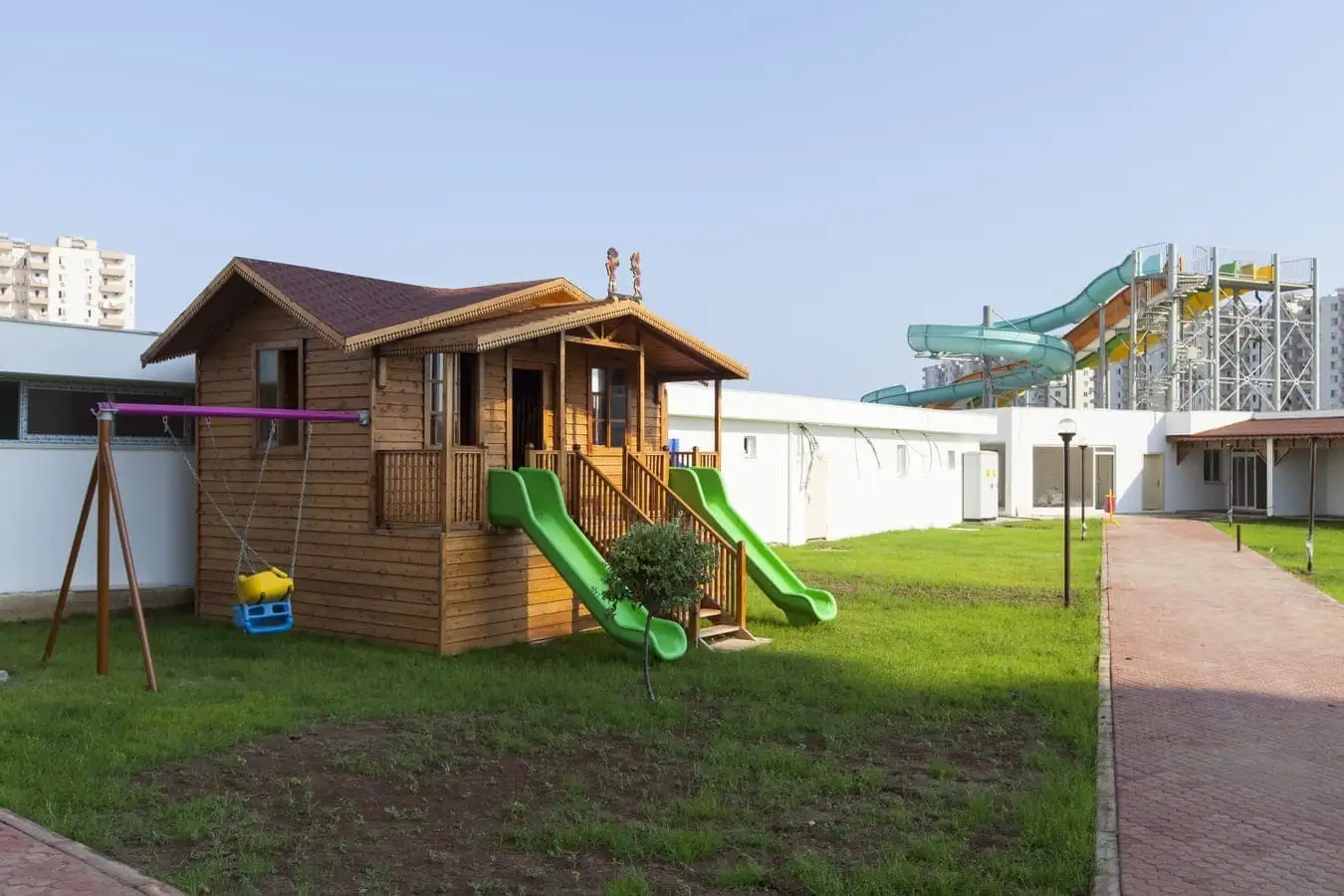 Что в комплексе: На закрытой территории комплекса расположены 6 блоков на 445 квартир, открытый бассейн с водными горками, открытые бассейны, детский бассейн, зона отдыха и барбекю, теннисный корт, баскетбольная/волейбольная площадка, спортивная площадка, хамам, массажная комната, финская сауна, открытая парковка, генератор.