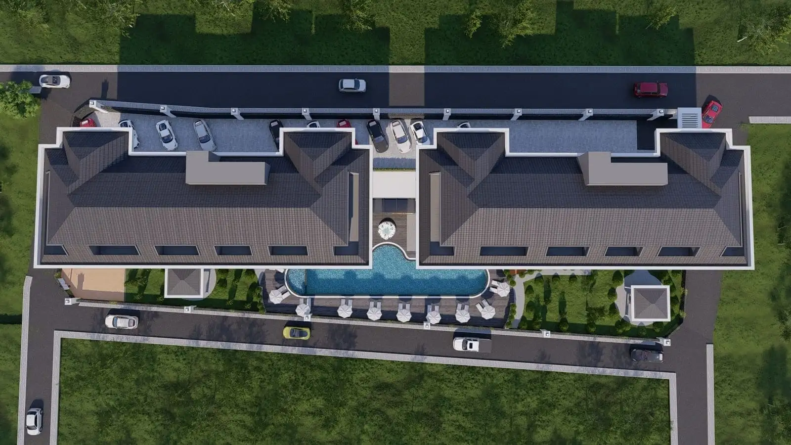 Что в комплексе: На закрытой, озелененной территории площадью 2 800 м2 будет расположено два жилых блока, открытый бассейн, зона отдыха у бассейна, детская площадка, зона отдыха и барбекю, беседка, открытая парковка для автомобилей и велосипедов, игровая комната, кафе, кинотеатр, фитнес, финская сауна, римская парная, хамам, массажный кабинет, генератор.