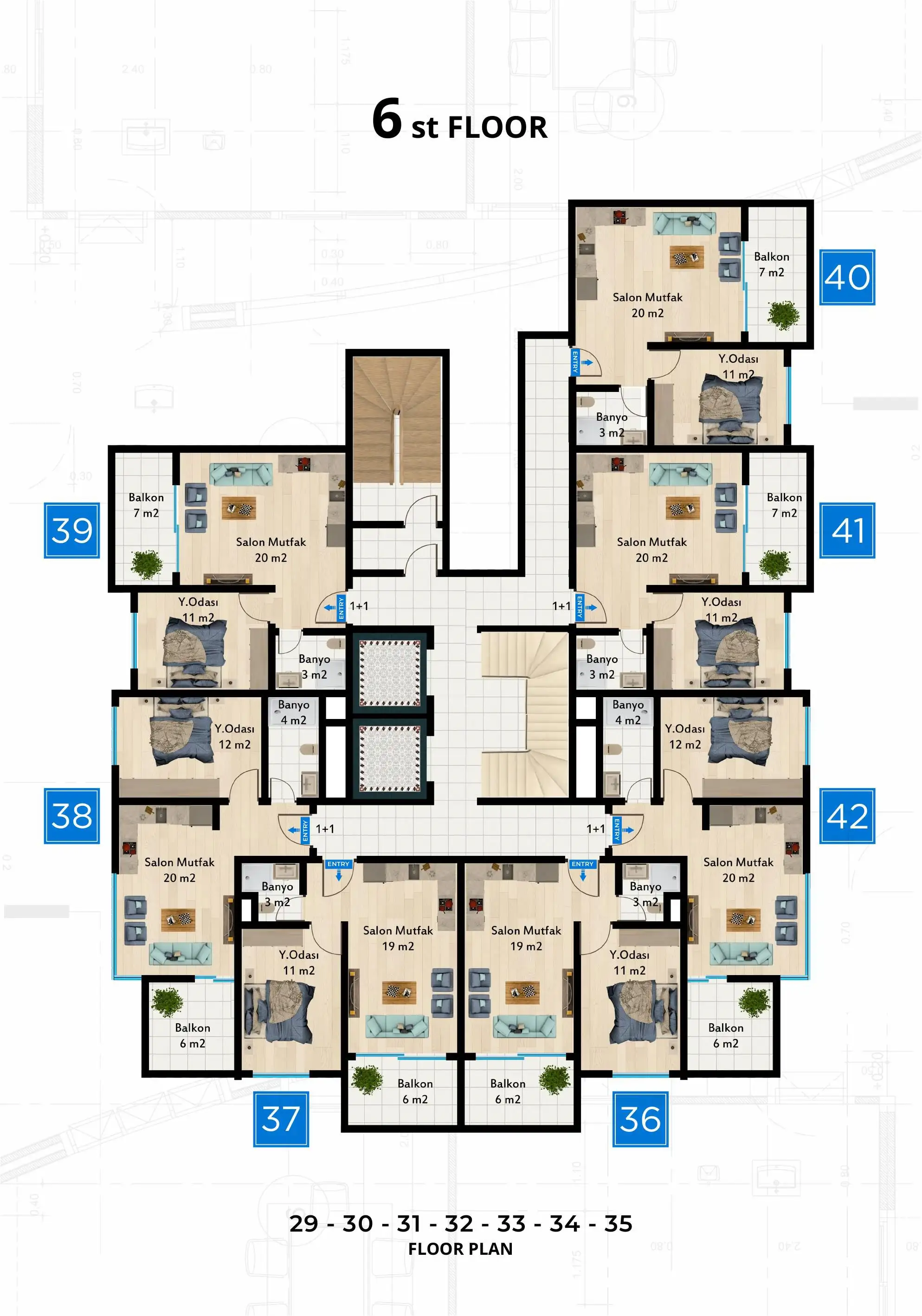 апартаменты планировкой 1+1, площадью от 50 до 55 м2;