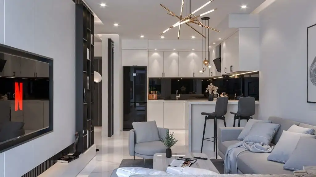 Апартаменты сдаются с полной чистовой отделкой с кухонным гарнитуром и оборудованными санузлами. Остается только выбрать красивую мебель и качественную бытовую технику, с чем мы вам поможем, в рамках бесплатного, послепродажного сервиса от нашей компании.