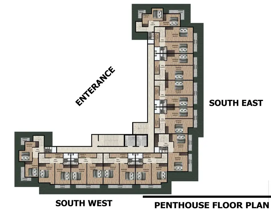 Внутри: Вы можете купить уютные апартаменты или двухэтажные пентхаусы следующих характеристик: