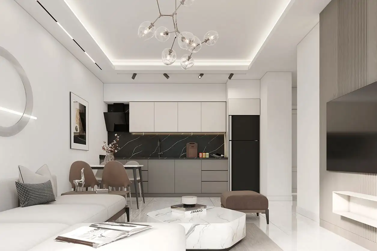 Апартаменты сдаются в полной чистовой отделке, с кухонным гарнитуром и оборудованными санузлами. Остается только выбрать красивую мебель и качественную бытовую технику, с чем мы вам поможем, в рамках бесплатного, послепродажного сервиса от нашей компании.