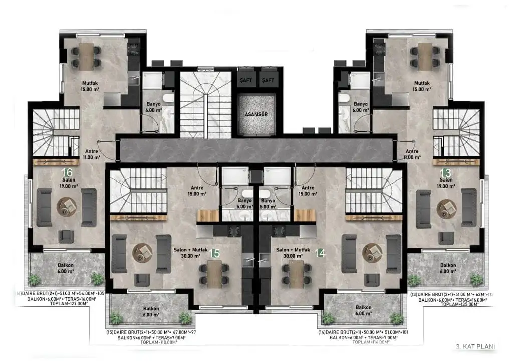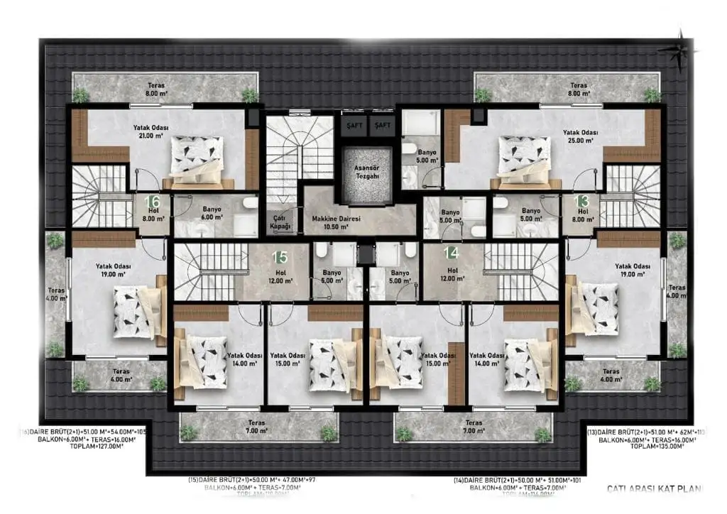 2+1 пентхаусы площадью от 110 м2 до 128 м2 .