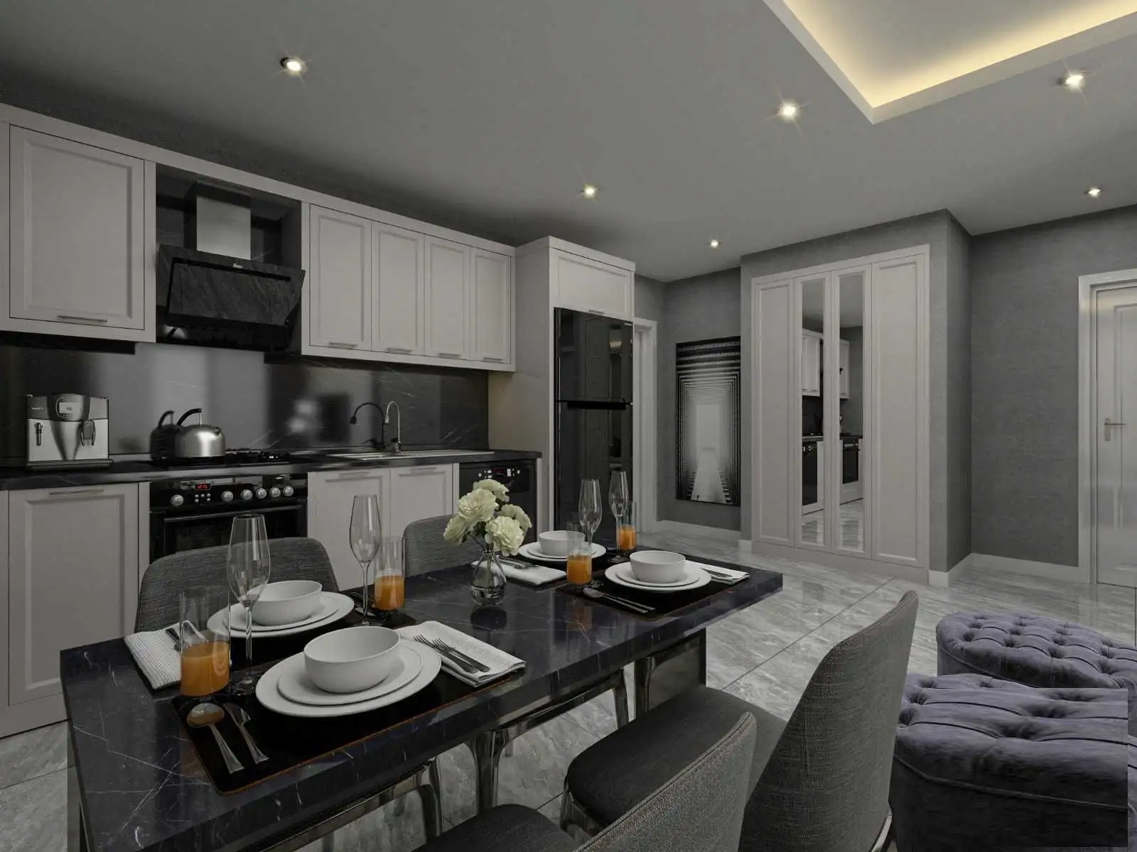 Квартиры будут сданы в чистовой отделке. Полы будут выполнены из керамогранита, на стены нанесена моющаяся краска, санузлы будут полностью оборудованы, на кухне будет установлена керамическая столешница и встраиваемый кухонный гарнитур.
