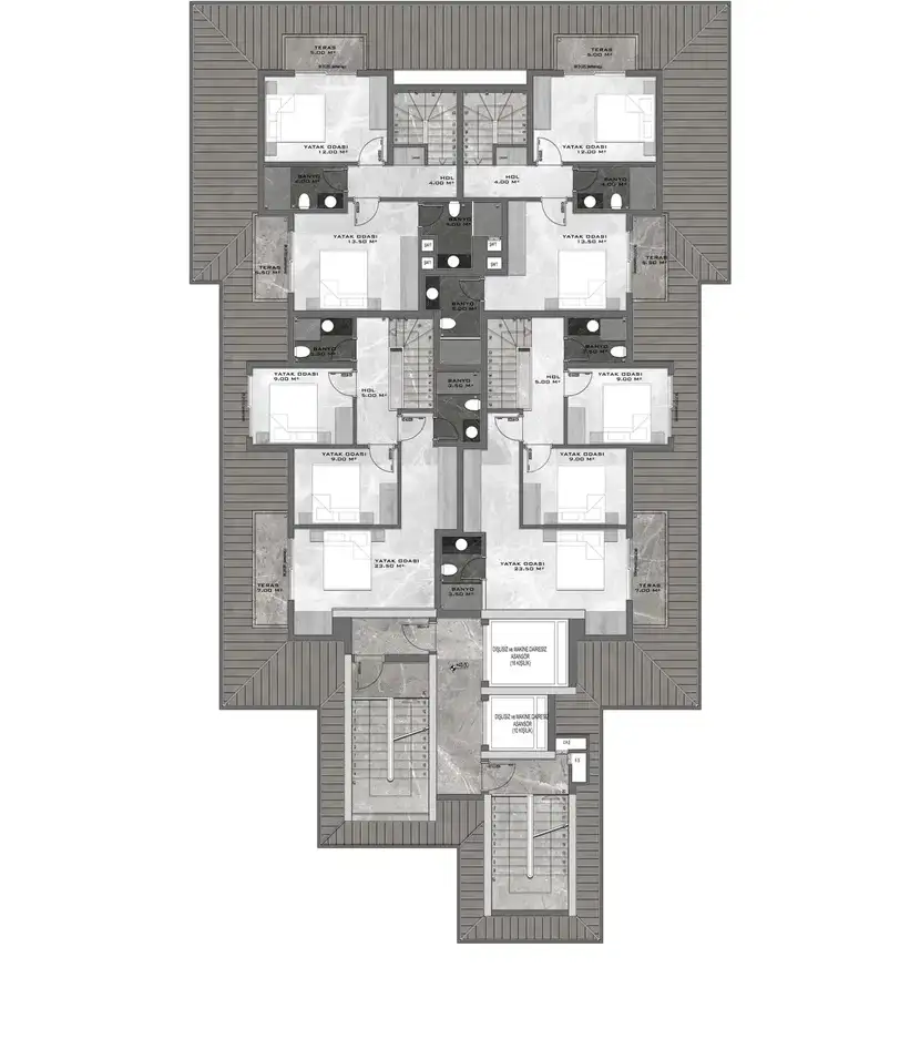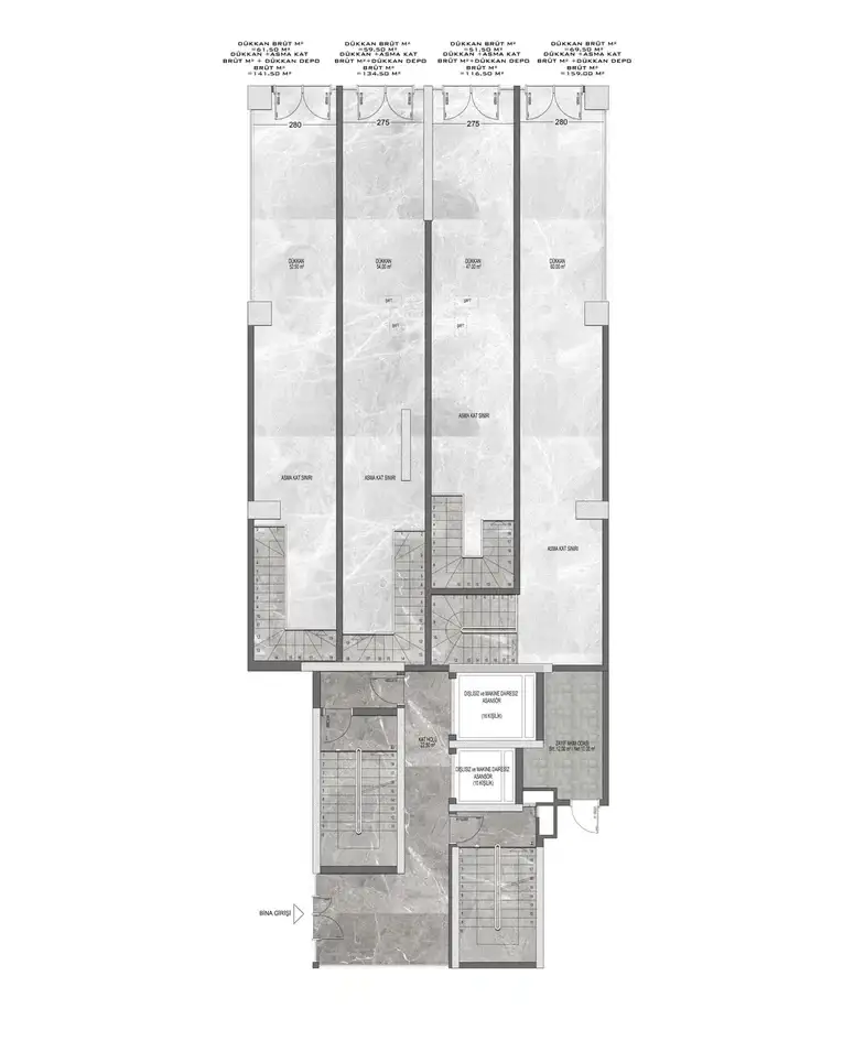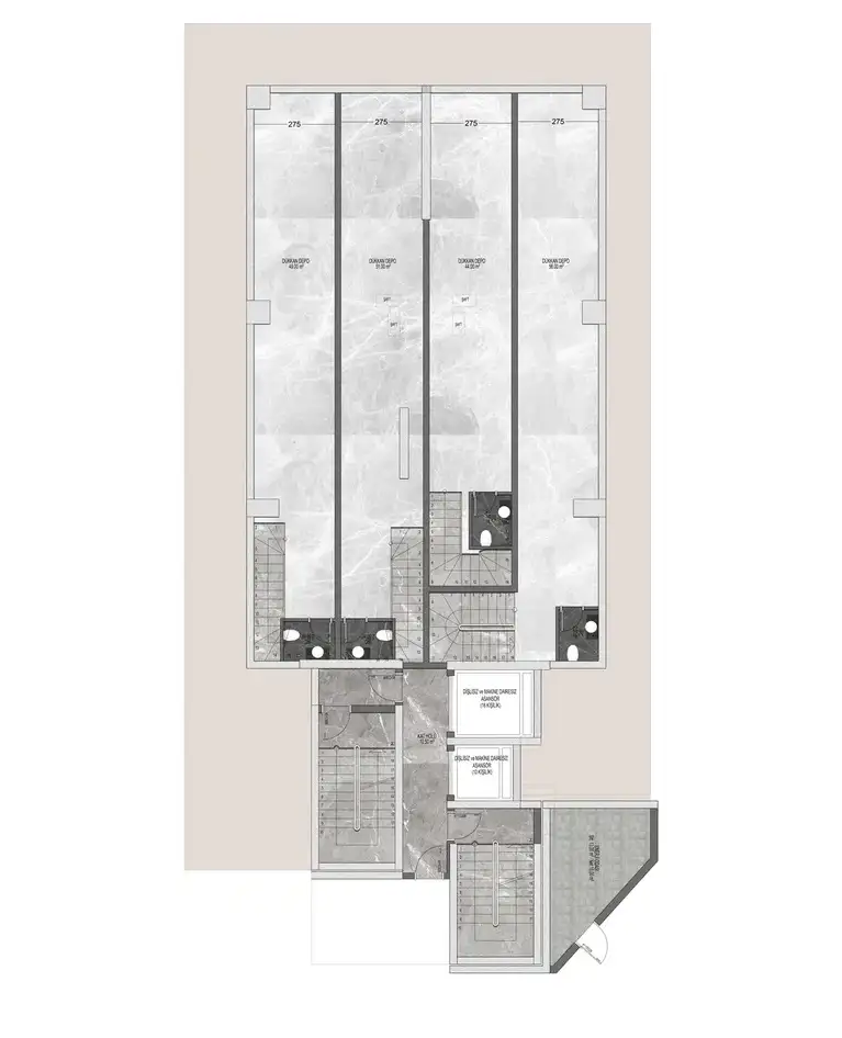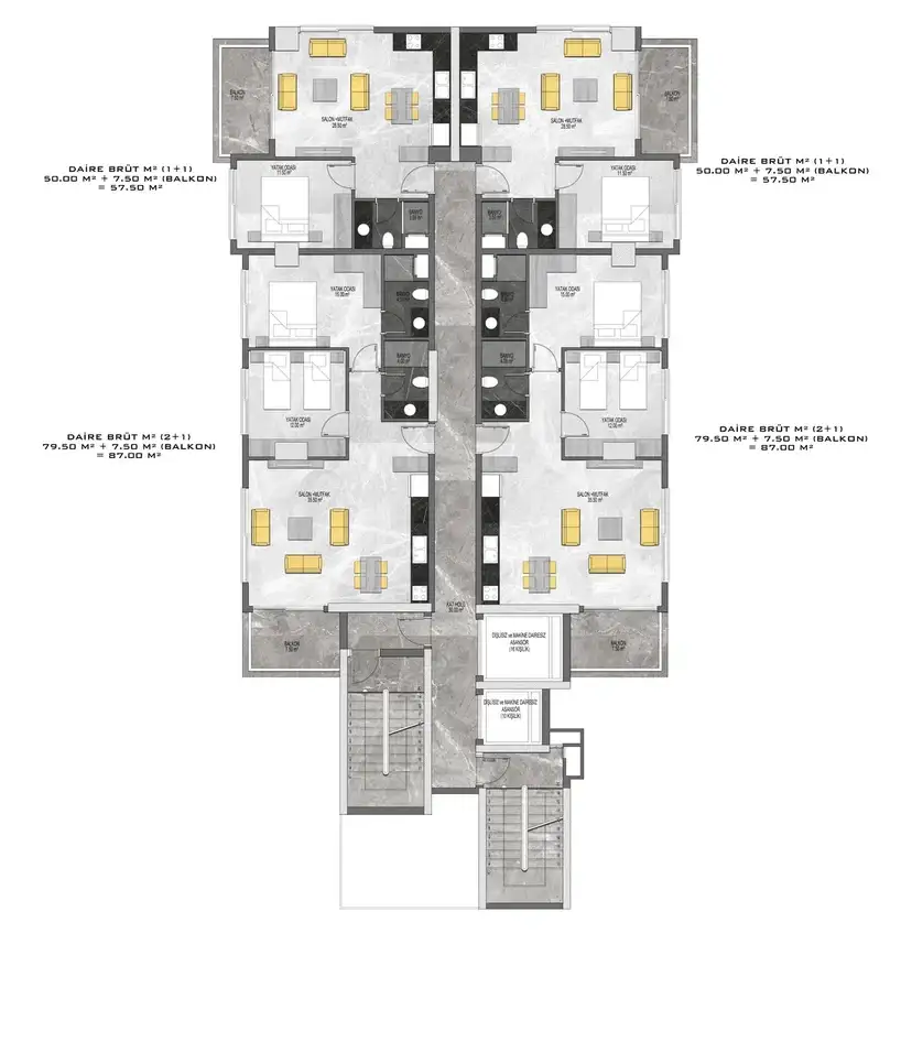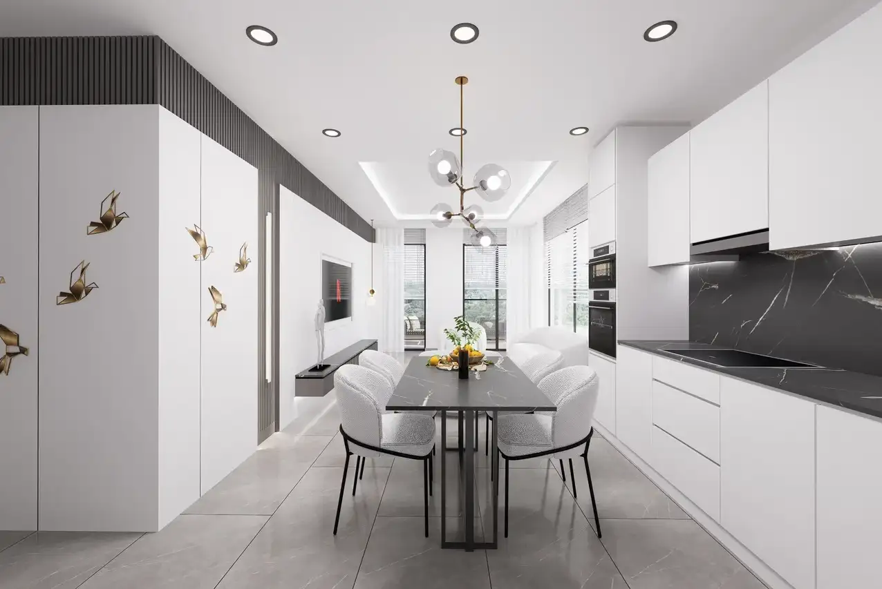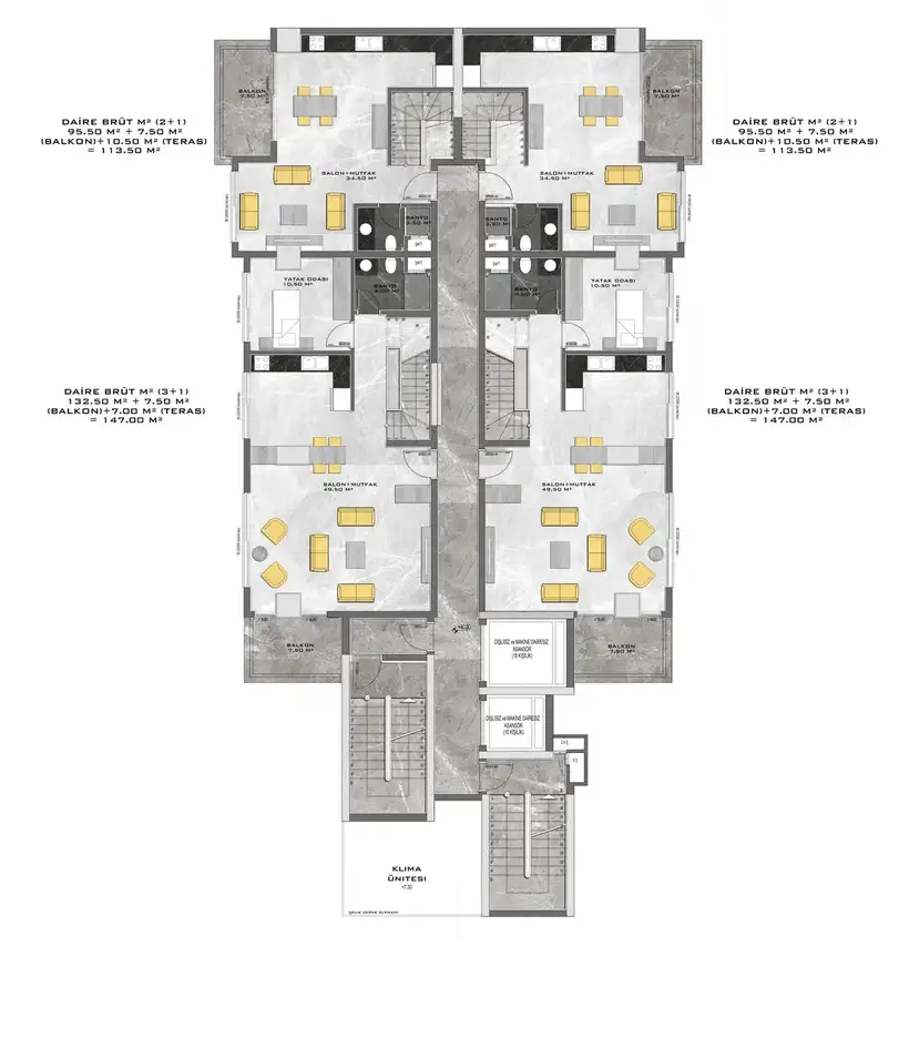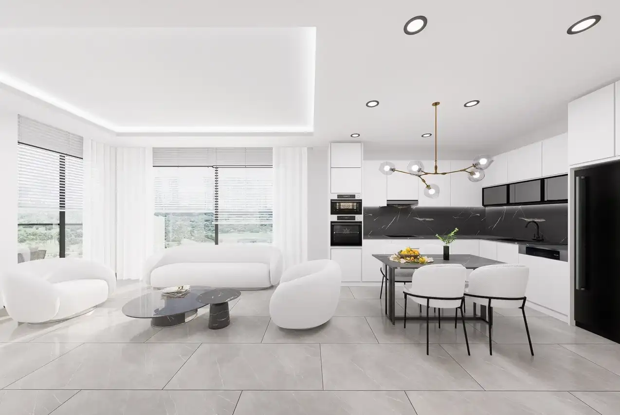 Внутри: В комплексе представлены различные планировки квартир: 1+1 (57,5 м²), 2+1 (87-93,5 м²), пентхаусы 2+1 (100-117 м²) и пентхаусы 4+1 (147-187 м²). Квартиры будут сданы в чистовой отделке с использованием высококачественных строительных и отделочных материалов, предусмотрено панорамное остекление с двойным стеклопакетом и алюминиевым профилем, а также электрический подогрев пола в санузлах.