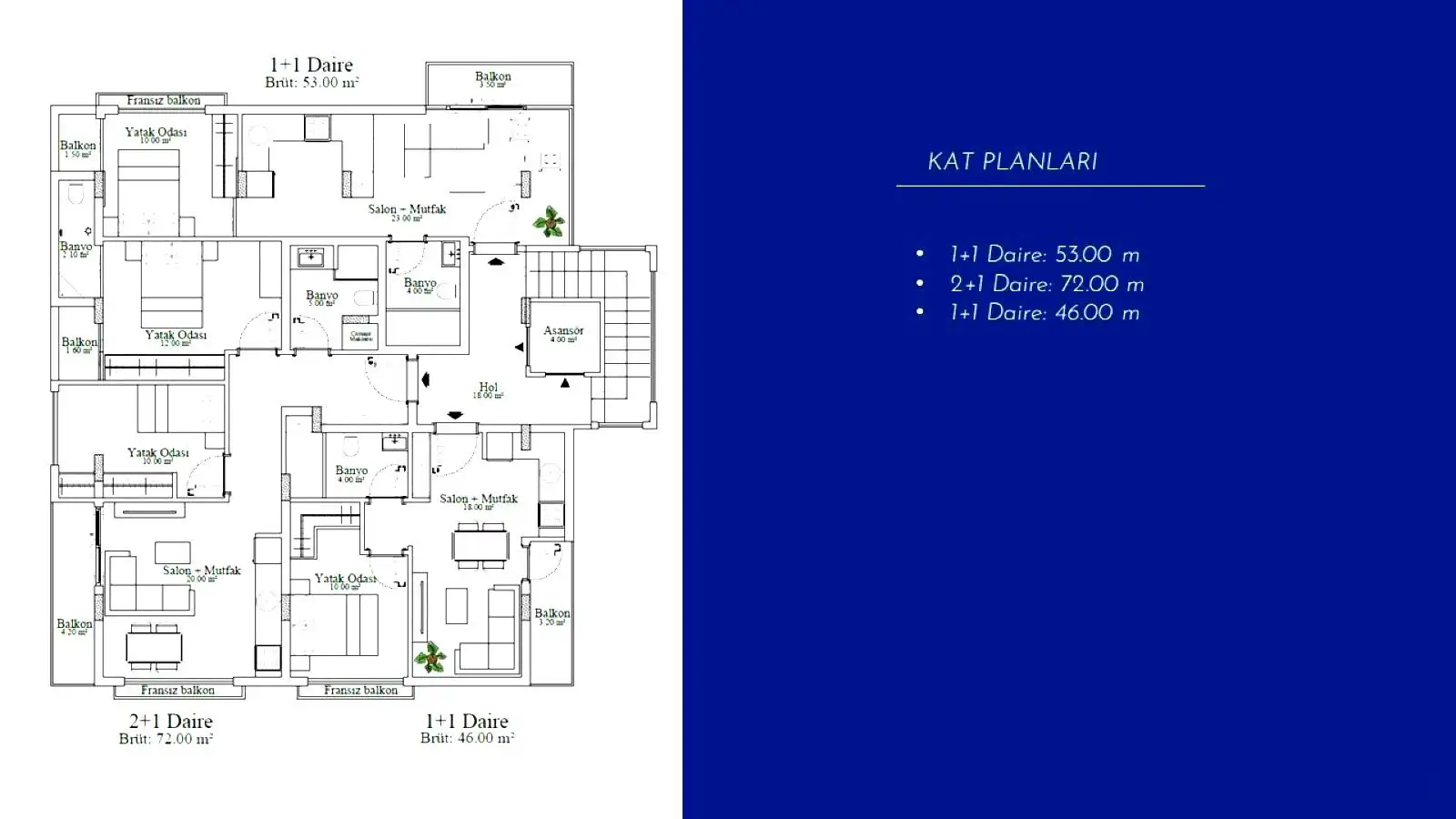 Апартаменты планировкой 2+1, площадью от 53 до 72 м2,