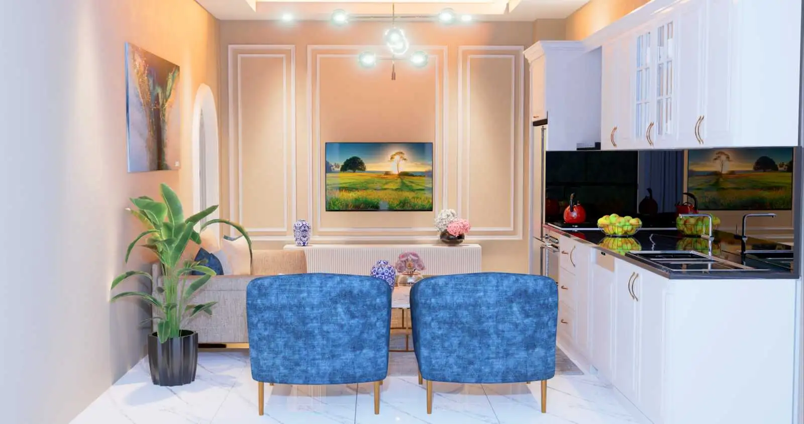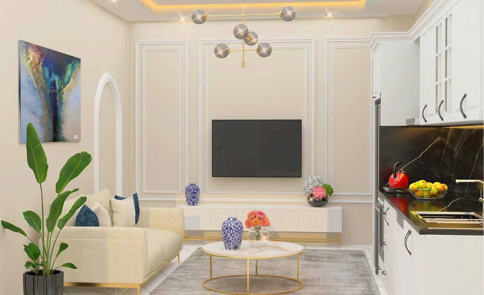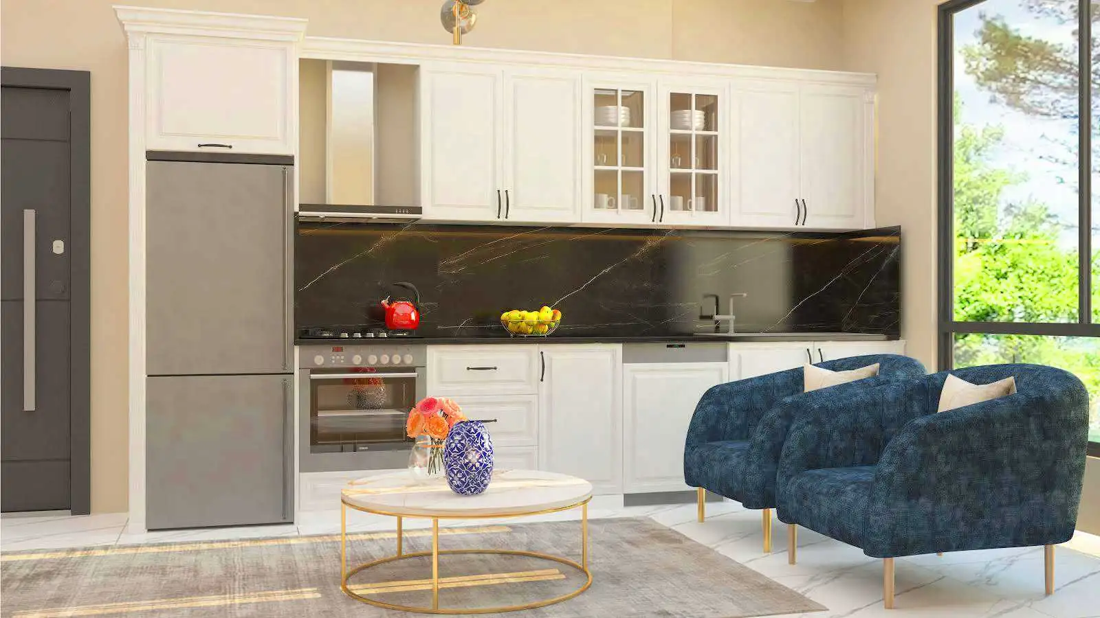 Внутри: Мы предлагаем к продаже квартиры планировкой 1+1, площадью 46 м2, которые будут сдаваться с чистовой отделкой – керамическим покрытием пола, точечной подсветкой, стеклопакетами с двойным остеклением, а также кухонным гарнитуром с гранитной столешницей и полностью оборудованным санузлом.