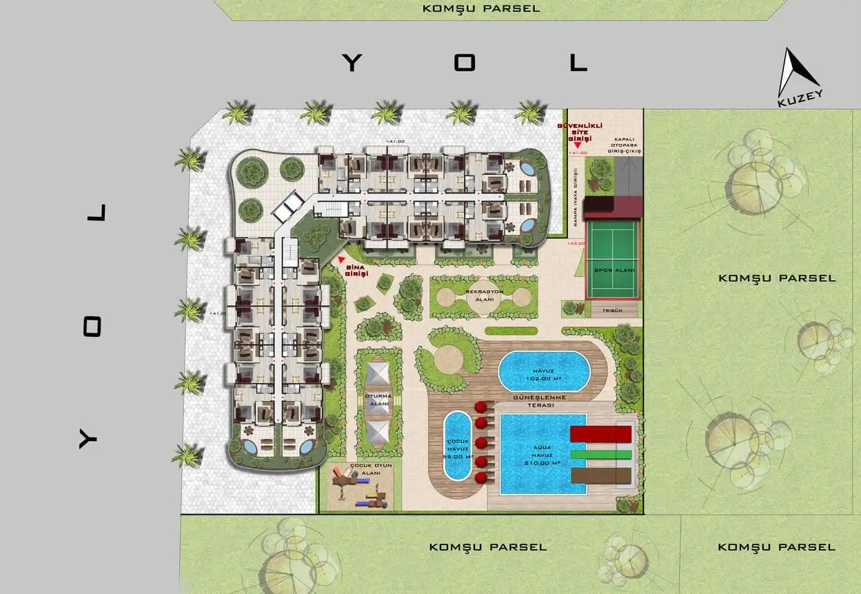 Что в комплексе: Комплекс разработан лучшими архитекторами и дизайнерами Турции. На закрытой территории будет расположен один большой 9-этажный блок уникального дизайна, открытый бассейн с водными горками, детский бассейн, зона отдыха у бассейна, детская площадка, беседки для отдыха, зона отдыха и барбекю, теннисный корт, финская сауна, фитнес, крытая парковка, генератор.