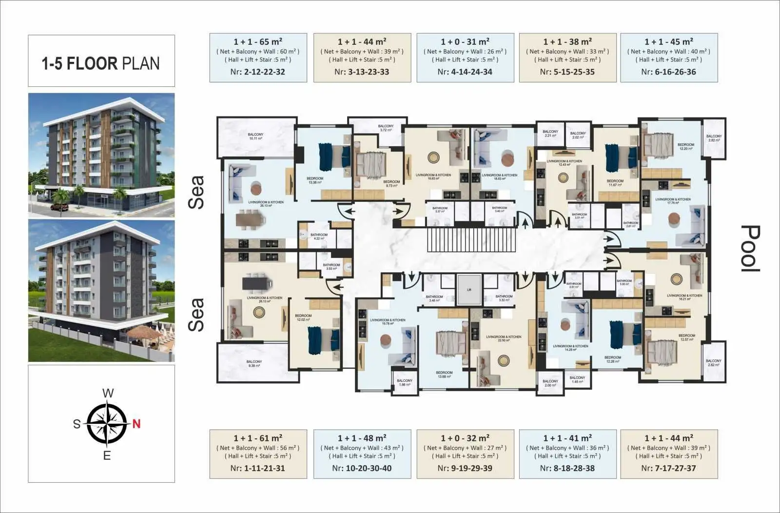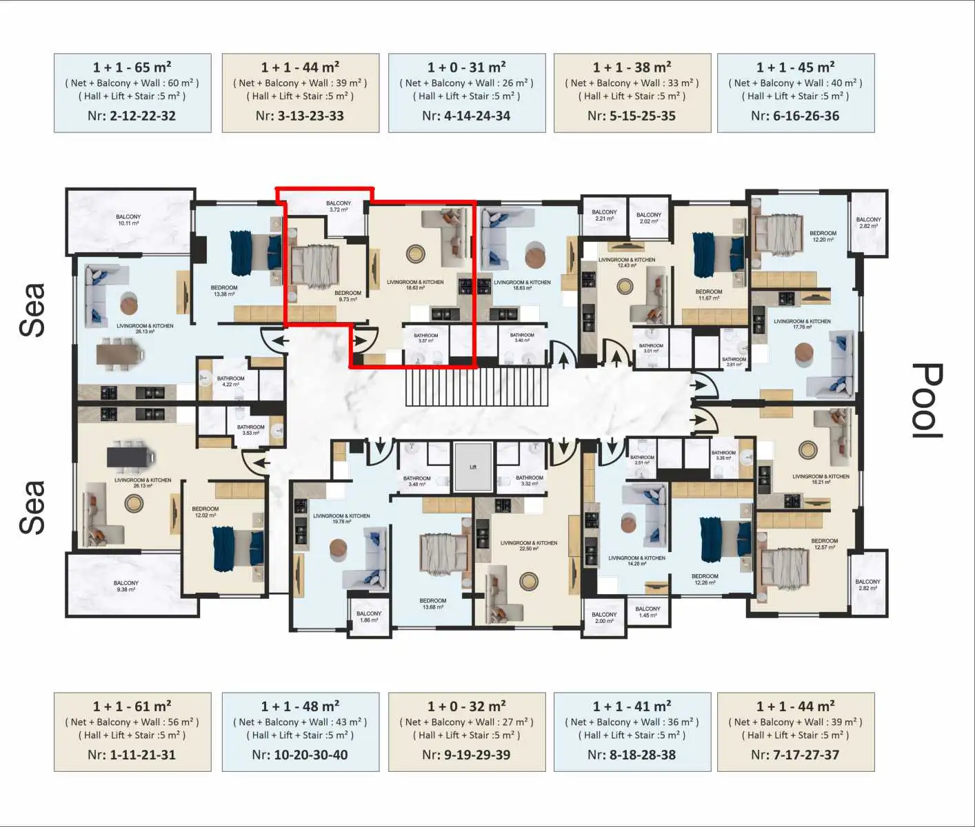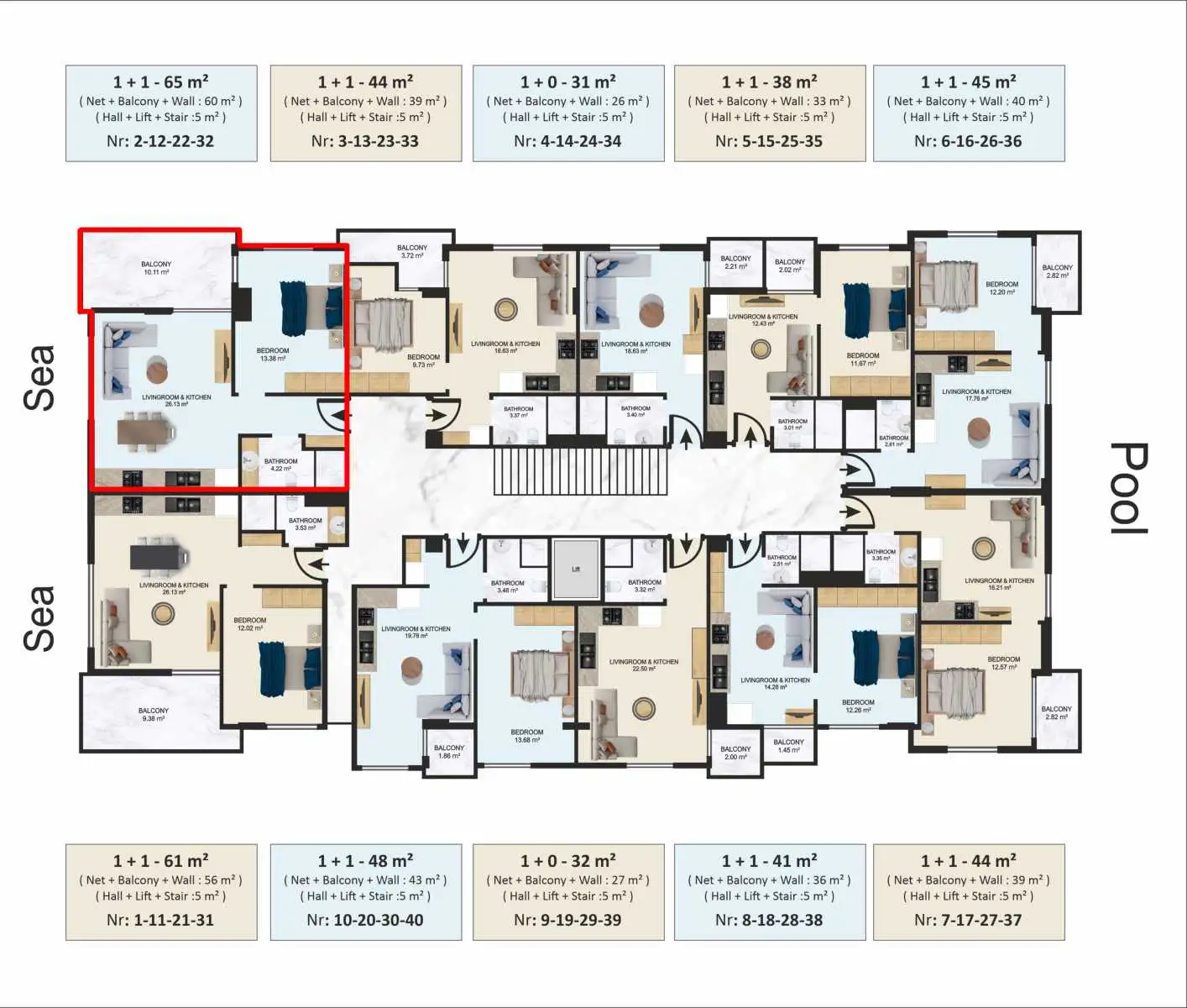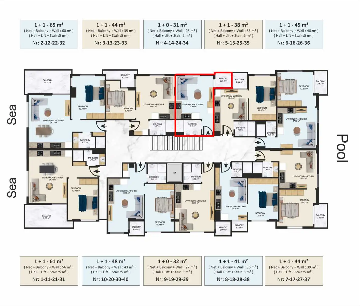 Апартаменты планировкой 1+1, площадью от 38 до 65 м2.