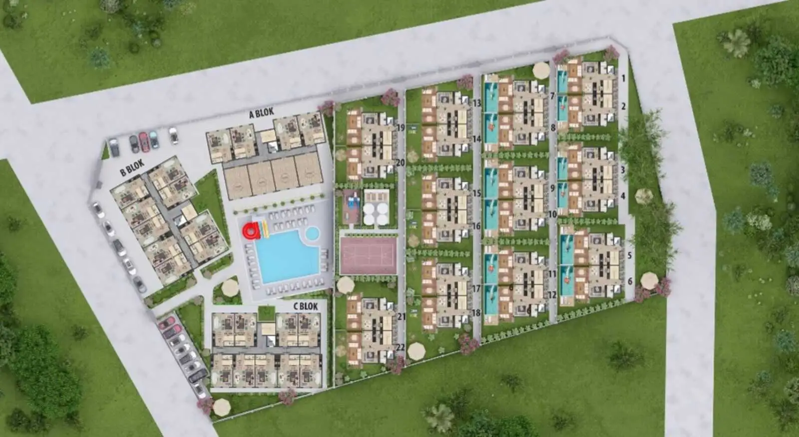 Внутри: В комплексе будут размещаться частные виллы и двухуровневые квартиры.
