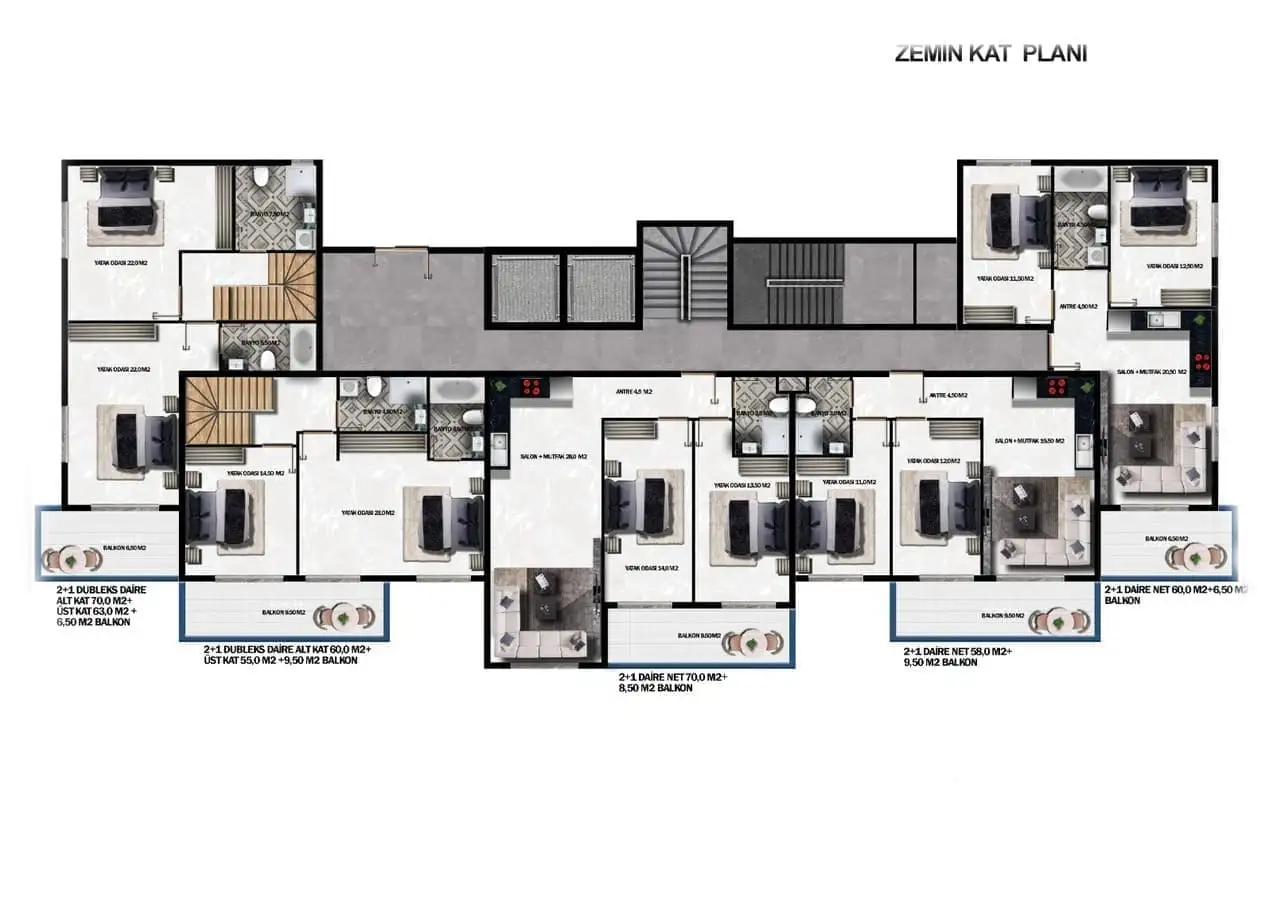 2+1 дуплексы площадью 124 м2 и 139,5 м2;