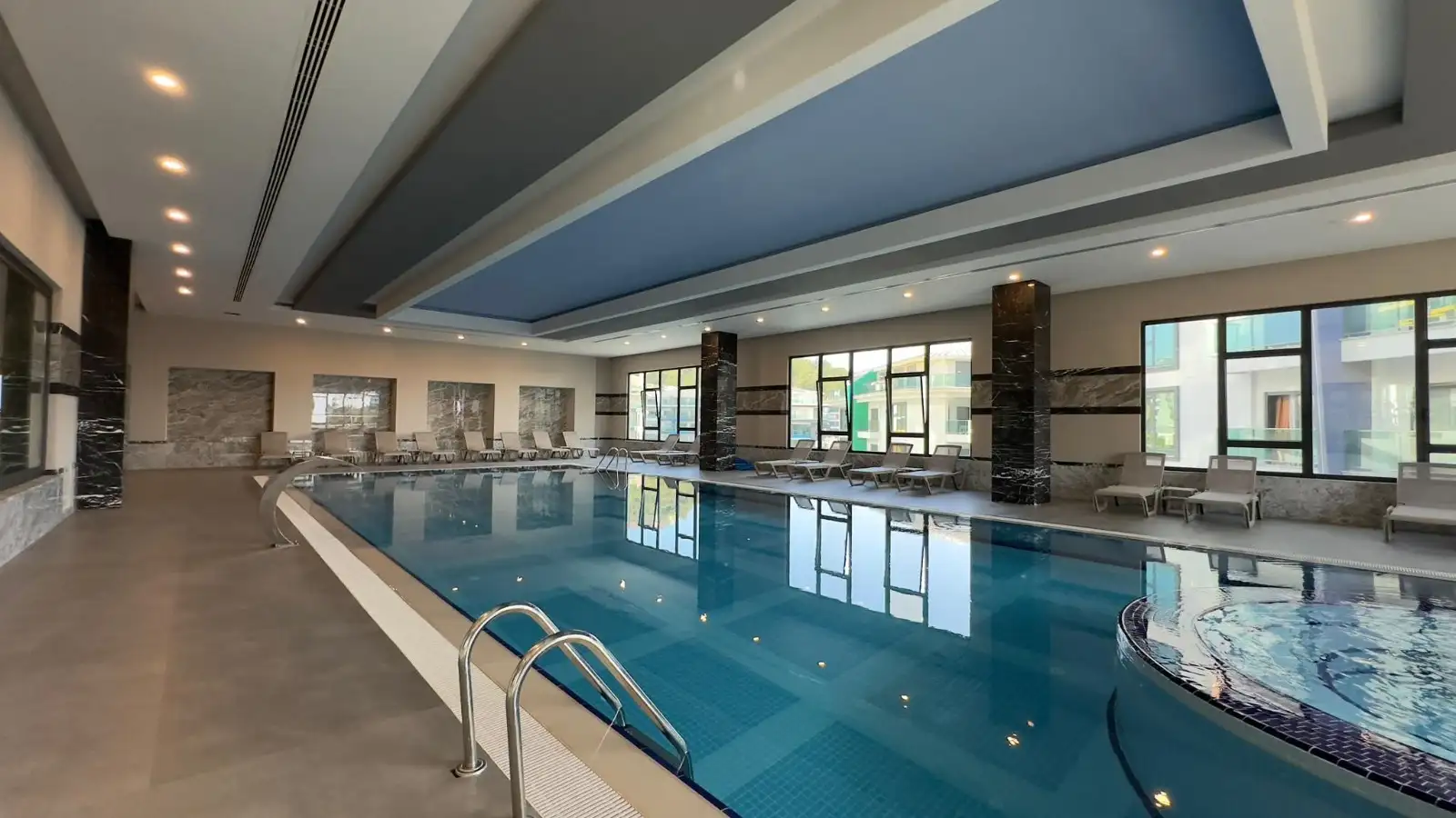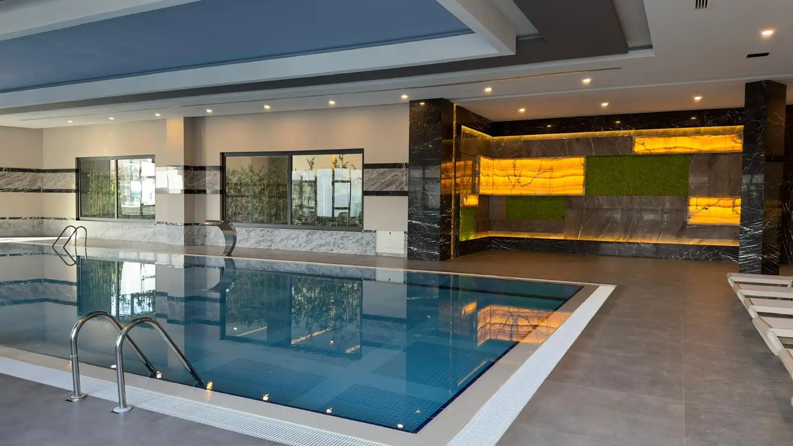 Внутри: закрытый бассейн, ресторан, хамам, паровая комната, сауна, соляная комната, массажные кабины, раздевалки, фитнес-зал, залы йоги и пилатеса, бильярд, настольный теннис, сквош, кинотеатр.