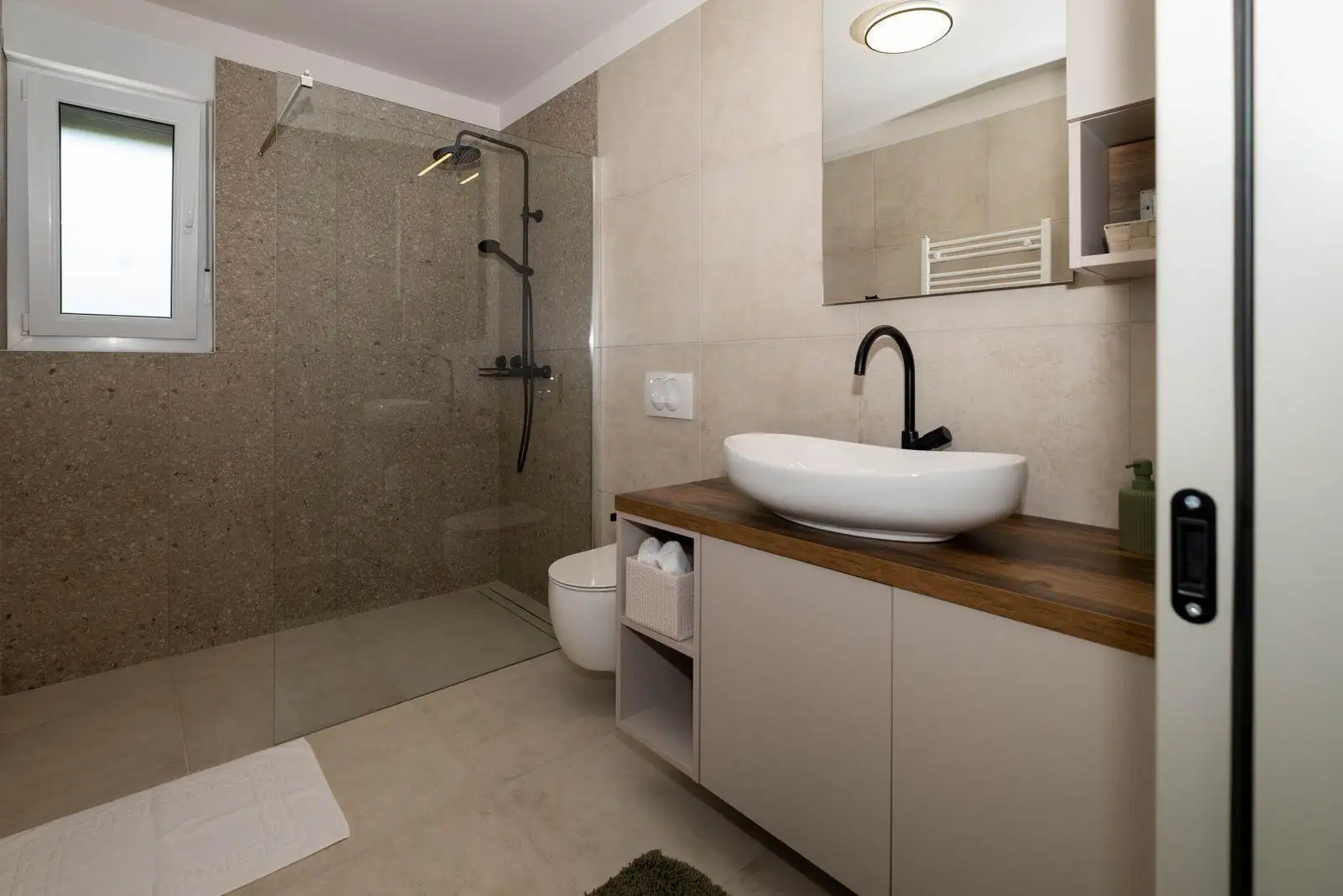 Второй этаж состоит из двух просторных спален, каждая из которых имеет собственную ванную комнату. Обе комнаты имеют доступ к большой крытой террасе, с которой открывается приятный вид на окружающую зелень и спокойный природный ландшафт. Вилла оборудована высококачественными напольными покрытиями, премиальными керамическими плитками, современным санитарным оборудованием и тщательно подобранной электротехникой. В всех комнатах установлены мультисплит-системы кондиционирования, обеспечивающие эффективное охлаждение и отопление в течение всего года, в то время как в ванных комнатах предусмотрено комфортное подогрев пола. Интерьер оформлен в современном стиле с качественной мебелью, которая подчеркивает общую элегантность и функциональность жилых пространств.