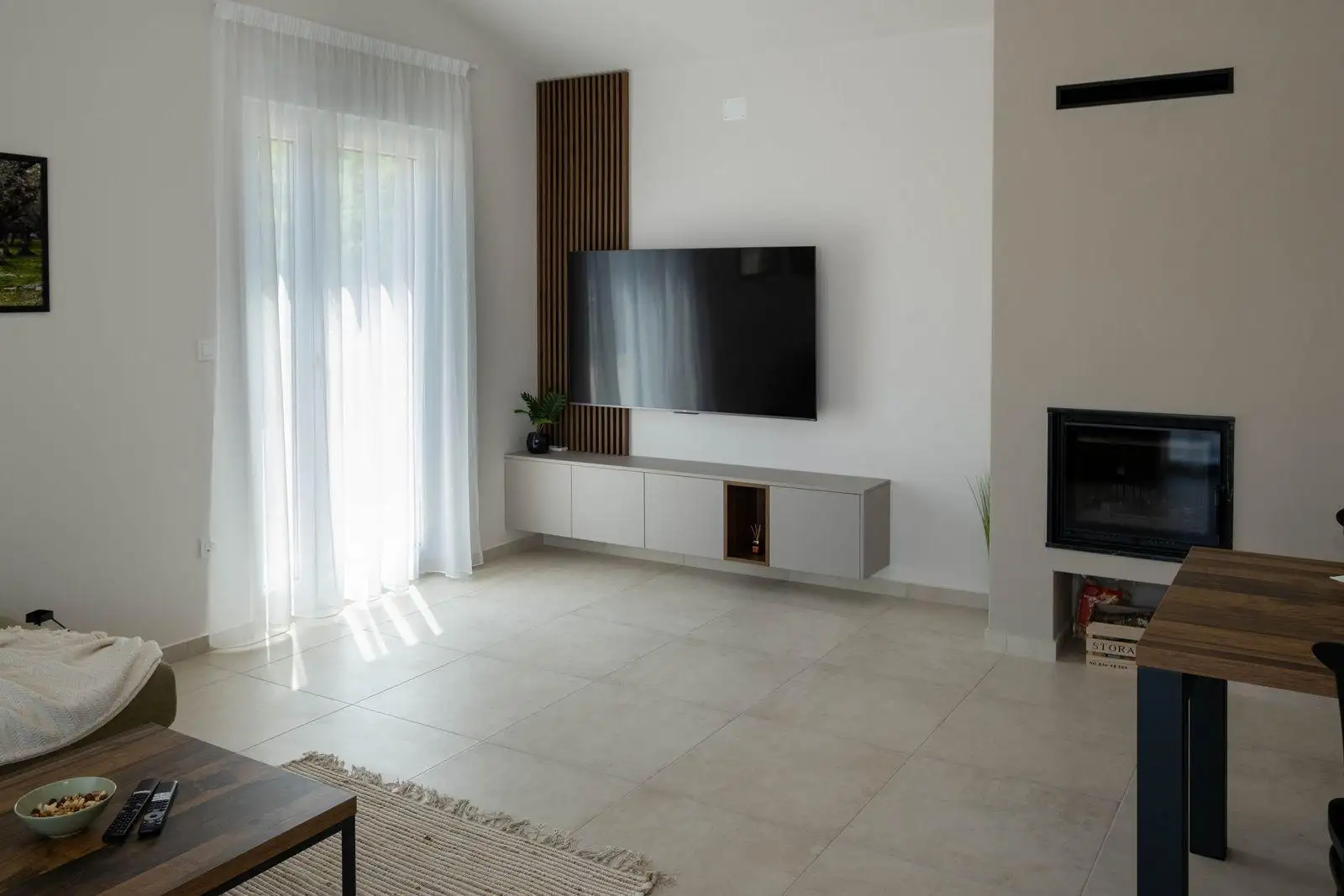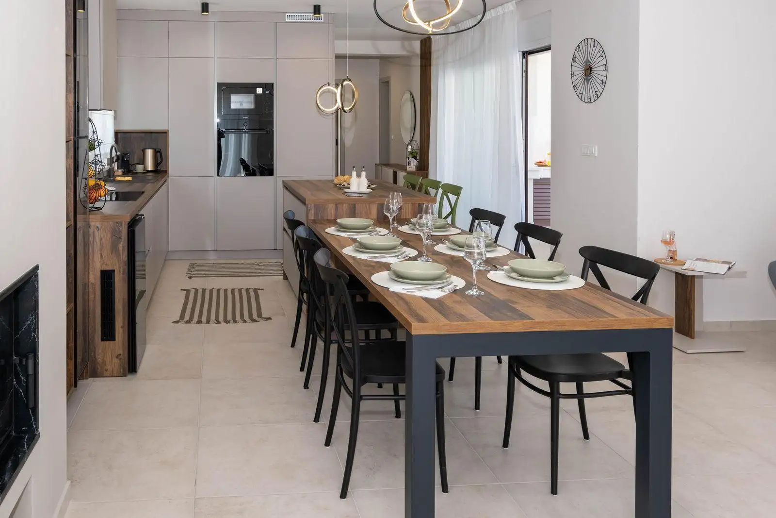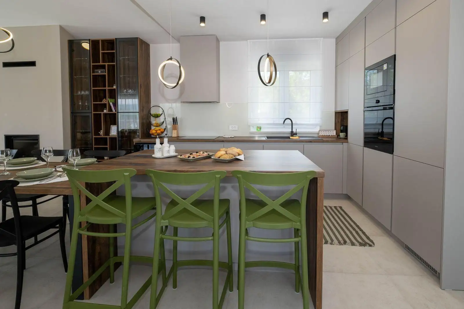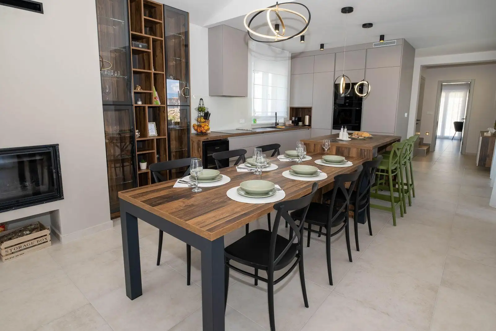Вилла продуманно спроектирована на двух этажах, сочетая современную архитектуру с высококачественными материалами и элегантным интерьером. На первом этаже находится просторная гостиная открытой планировки, которая включает современную кухню, обеденную зону и светлую гостиную. Большие стеклянные проемы позволяют естественному свету заполнять пространство и обеспечивают прямой выход на крытую террасу. Этот уровень также включает одну комфортабельную спальню с отдельной ванной комнатой, кладовую и отдельный туалет для гостей. Из гостиной есть прямой выход на крытую террасу, оборудованную барбекю и летней кухней, создавая идеальное пространство для обедов на свежем воздухе и отдыха рядом с благоустроенным садом и бассейном.
