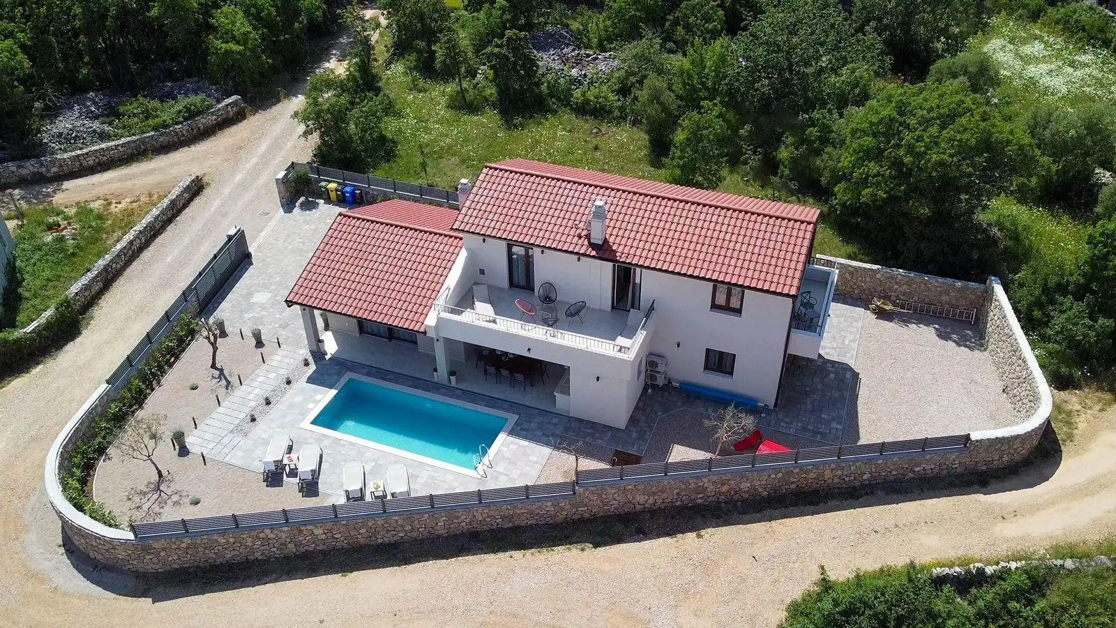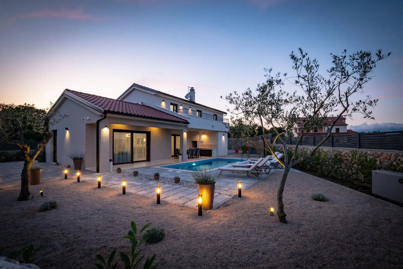 Участок полностью огорожен и красиво благоустроен, предлагая уединение и расслабляющую средиземноморскую атмосферу. Сад включает автоматическую систему полива и стильный подогреваемый бассейн с просторной зоной для загара, идеально подходящий для наслаждения теплым климатом Адриатического региона. Рядом с виллой расположены несколько частных парковочных мест, что обеспечивает удобство для жителей и гостей.