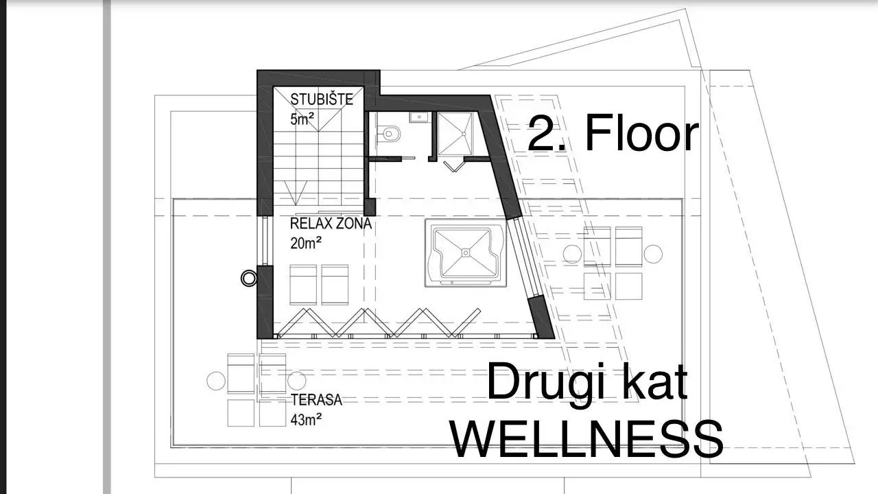 Третий этаж: Зона отдыха, предназначенная для джакузи, душа и туалета, ведущая на панорамную террасу на крыше площадью 90 м² – идеально для отдыха круглый год.