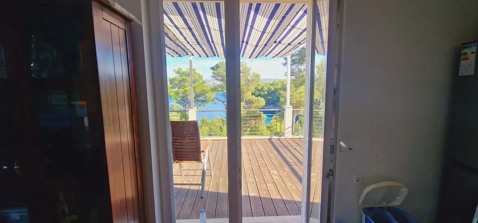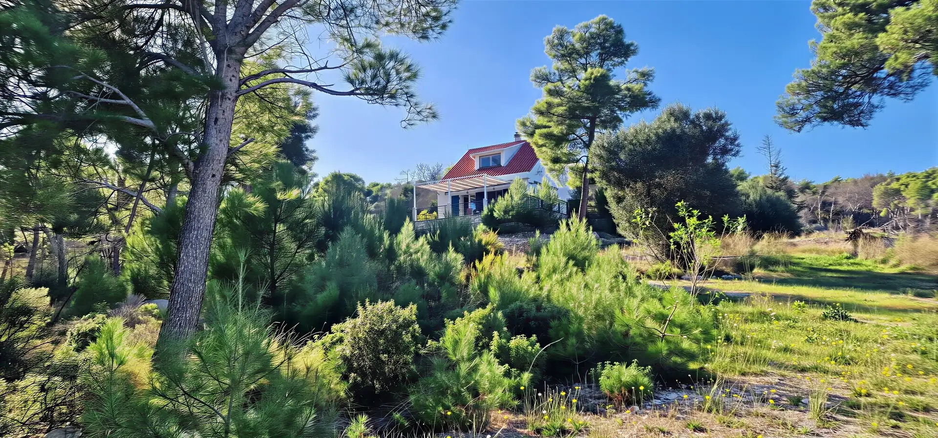 Дом предлагает примерно 120 м² жилой площади, включая просторную террасу с видом на море, три комфортабельные спальни, две ванные комнаты и открытую кухню с гостиной, расположенные на двух уровнях. Большие окна позволяют естественному свету заполнять интерьер, одновременно framing захватывающие виды на море из почти каждого уголка собственности. Окружающий средиземноморский сад мягко спускается к естественному каменистому побережью.