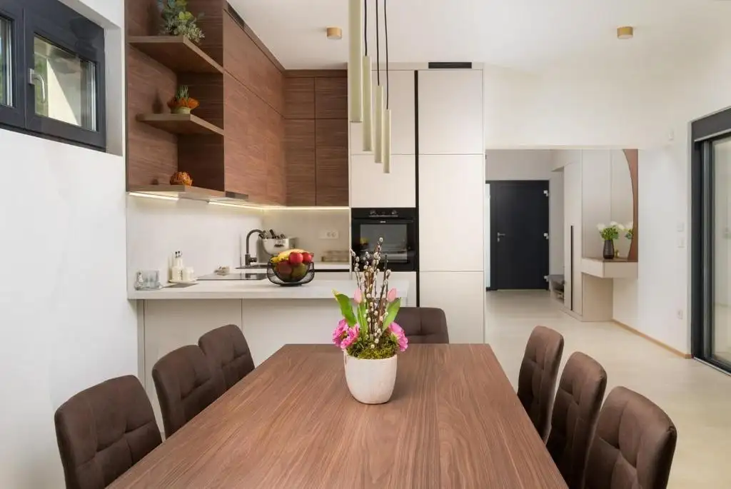 Вилла имеет общую площадь 188 м², из которых 139 м² жилой площади продумано спроектированы для удовлетворения потребностей современного жилья и стандартов высококлассной аренды. При входе вас встречает элегантное фойе с местом для гардероба, которое естественно переходит в просторную открытую гостиную. Эта зона включает в себя комфортную гостиную, столовую, подходящую для всей семьи, и полностью оборудованную современную кухню.
