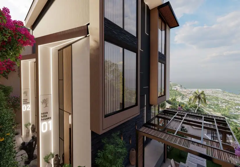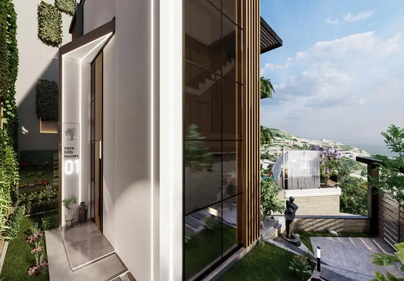 the Дверь частных вилл имеет высоту 240 см с двойной стальной дверью. В каждой вилле есть лифт. Кухни будут поставляться со встроенной в Samsung печью, капотной плитой, холодильником, стиральной машиной с функцией сушки, микроволновой печью и посудомоечной машиной. Зеркальные шкафы для ванной комнаты, набор душевой кабины, набор резервуаров Vitra