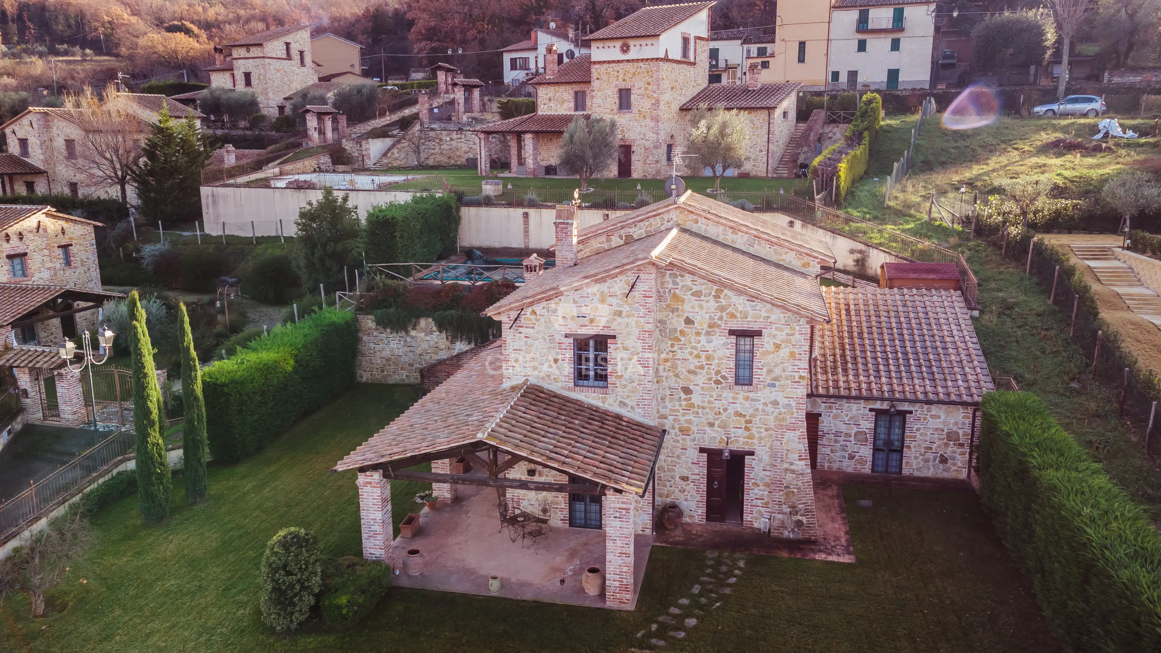 Недавно построенный каменный дом на двух уровнях площадью около 230 кв.м. Сад площадью около 1000 кв.м с бассейном. Недвижимость в небольшой средневековой деревушке в окружении пейзажных холмов Умбрии. На первом этаже расположены кухня, столовая/гостиная, ванная комната, многофункциональная комната/спальня и красивый портик снаружи. На втором этаже - три большие спальни с ванной комнатой каждая. Дом, построенный из камня, имеет типичные для Умбрии элементы - потолки с деревянными балками, терракотовые полы. Въезд на территорию непосредственно с дороги общего пользования через автоматические ворота. Хорошая коммуникация - 20 минут до выезда на автостраду А1 (съезд Аттильяно), 10 минут до железнодорожной станции Альвиано, до близлежащей средневековой деревушки Монтеккьо (5 минут на машине), где есть все необходимые объекты инфраструктуры, такие как минимаркет, мясная лавка, ресторан, бар, почта, банк, мед. учреждение, аптека и т.д..