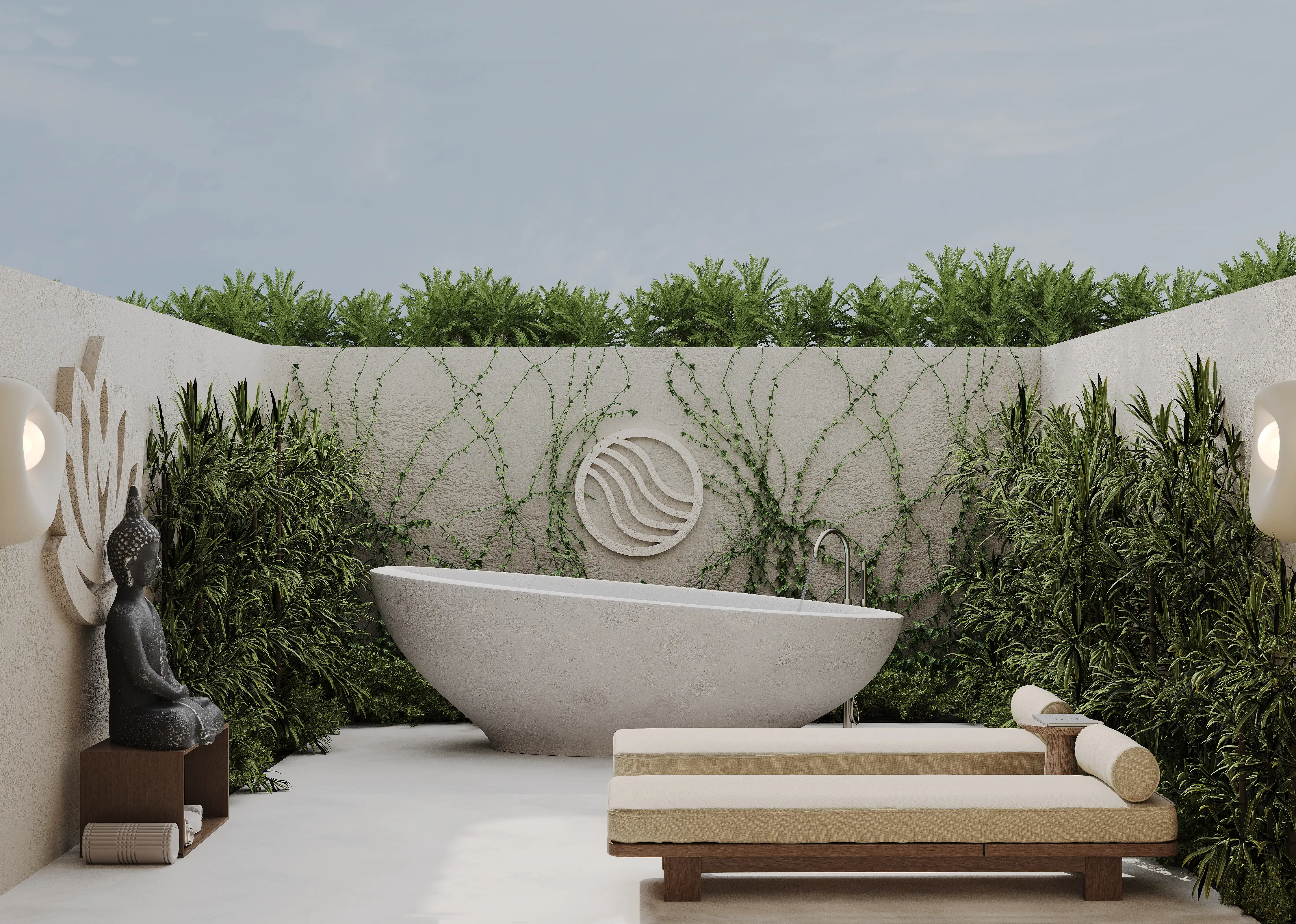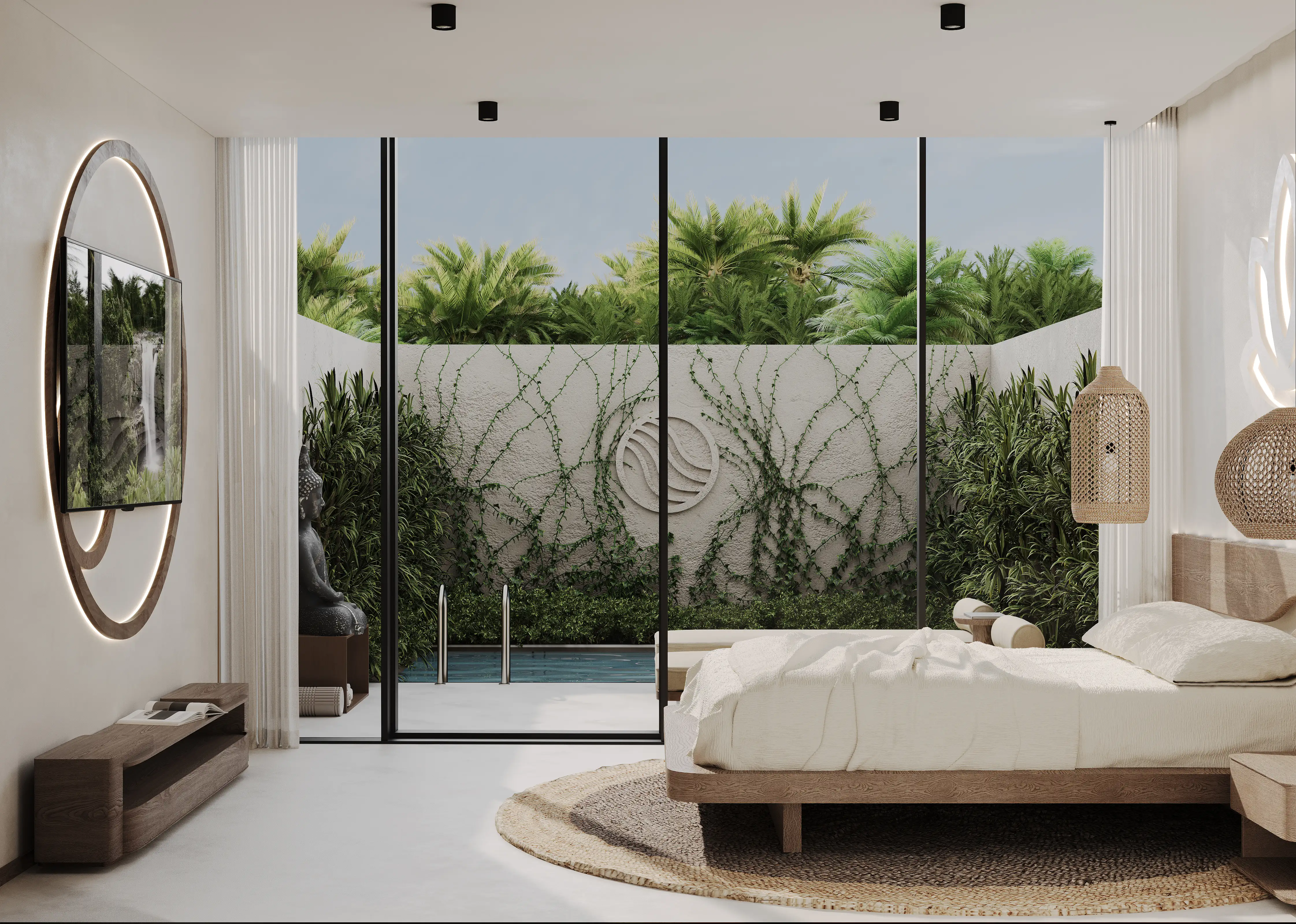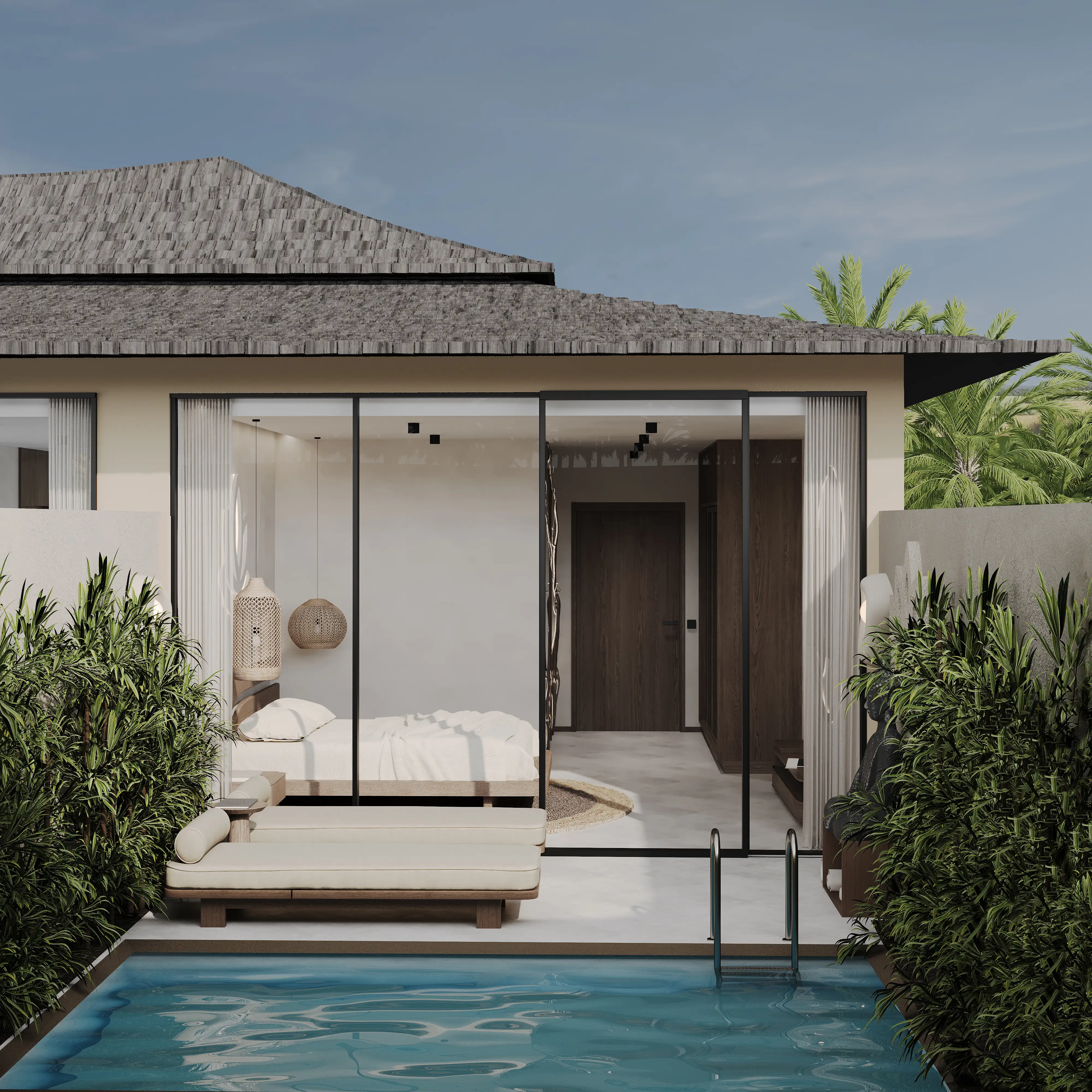 На участке площадью 50 кв. м с размером здания 25 кв. м вилла доступна в нескольких вариантах макета, что позволяет вам выбирать между частным бассейном, открытой ванной или пышной садовой зоной, которая усиливает ощущение пространства и связи с природой. Каждый уголок призван объединить комфорт и функциональность, охватывая как современный дизайн, так и тропический характер.