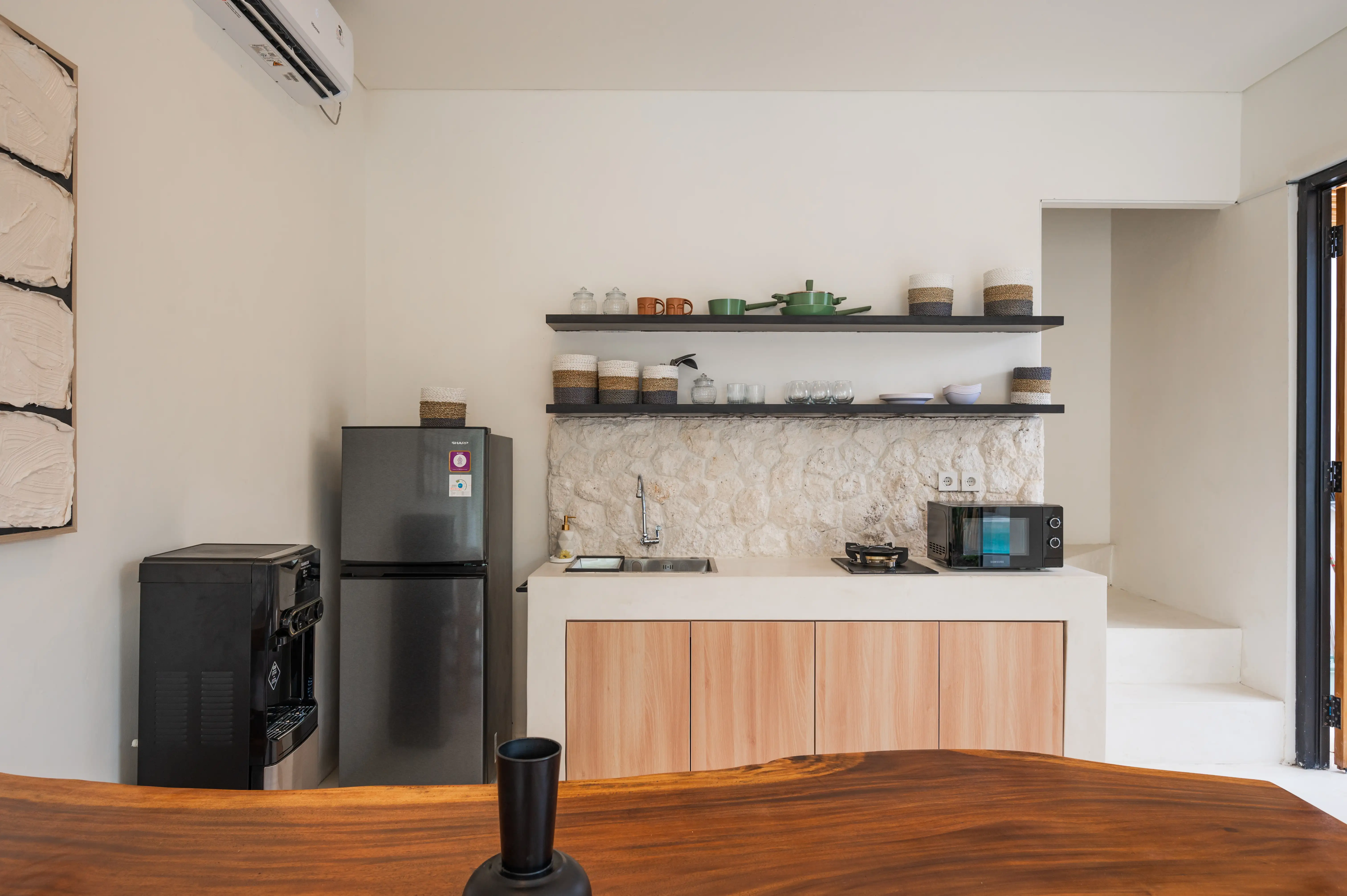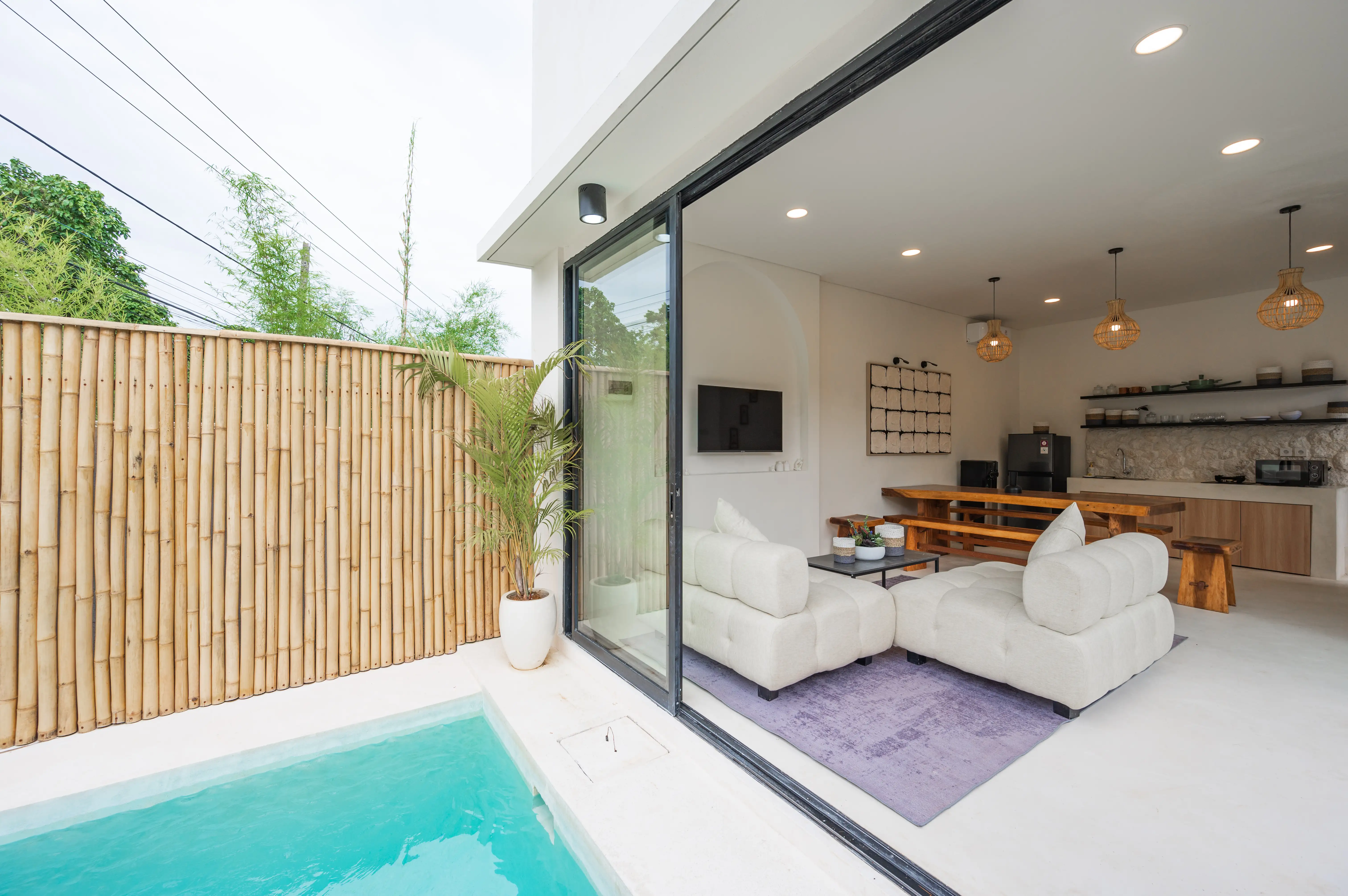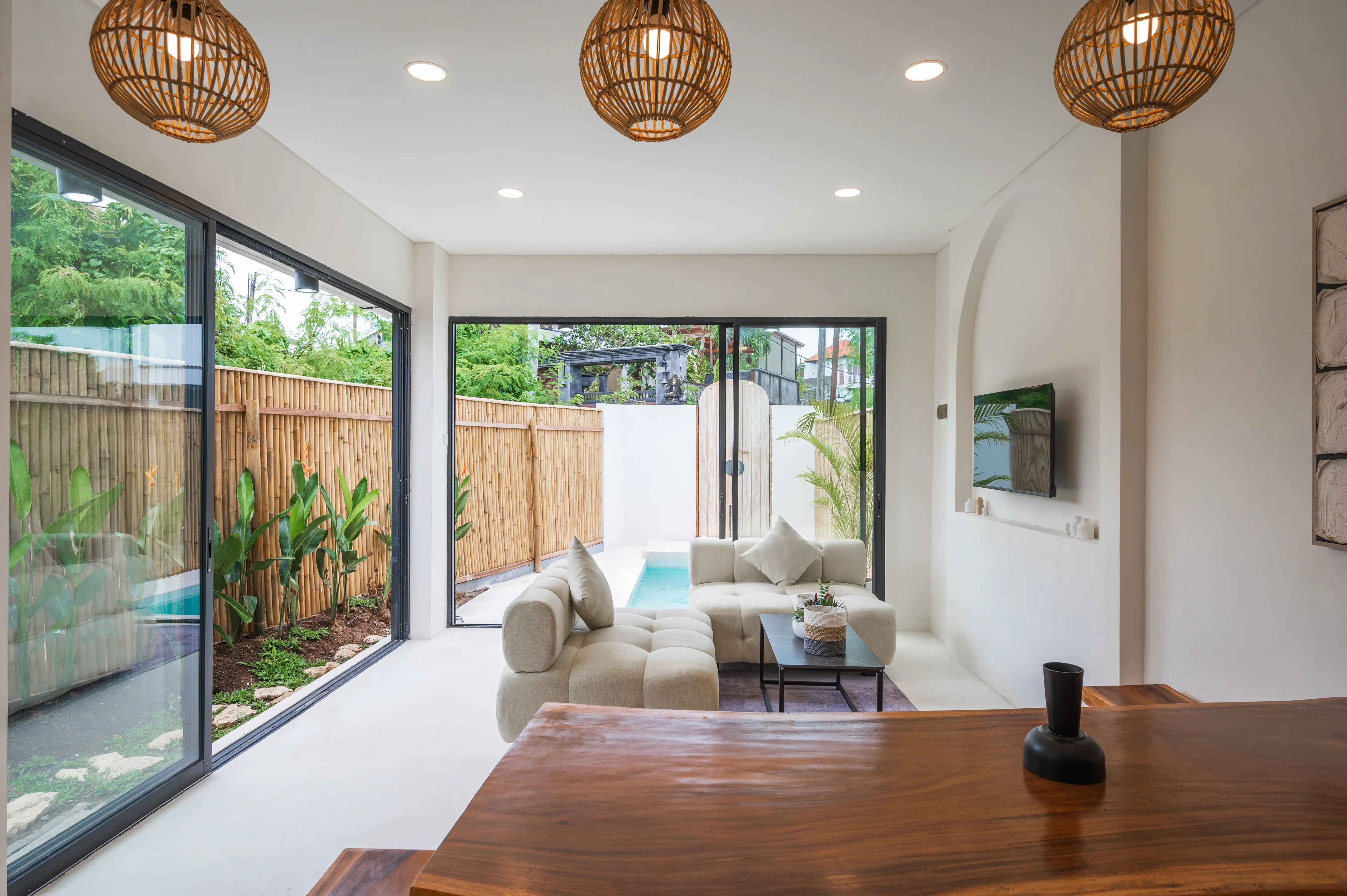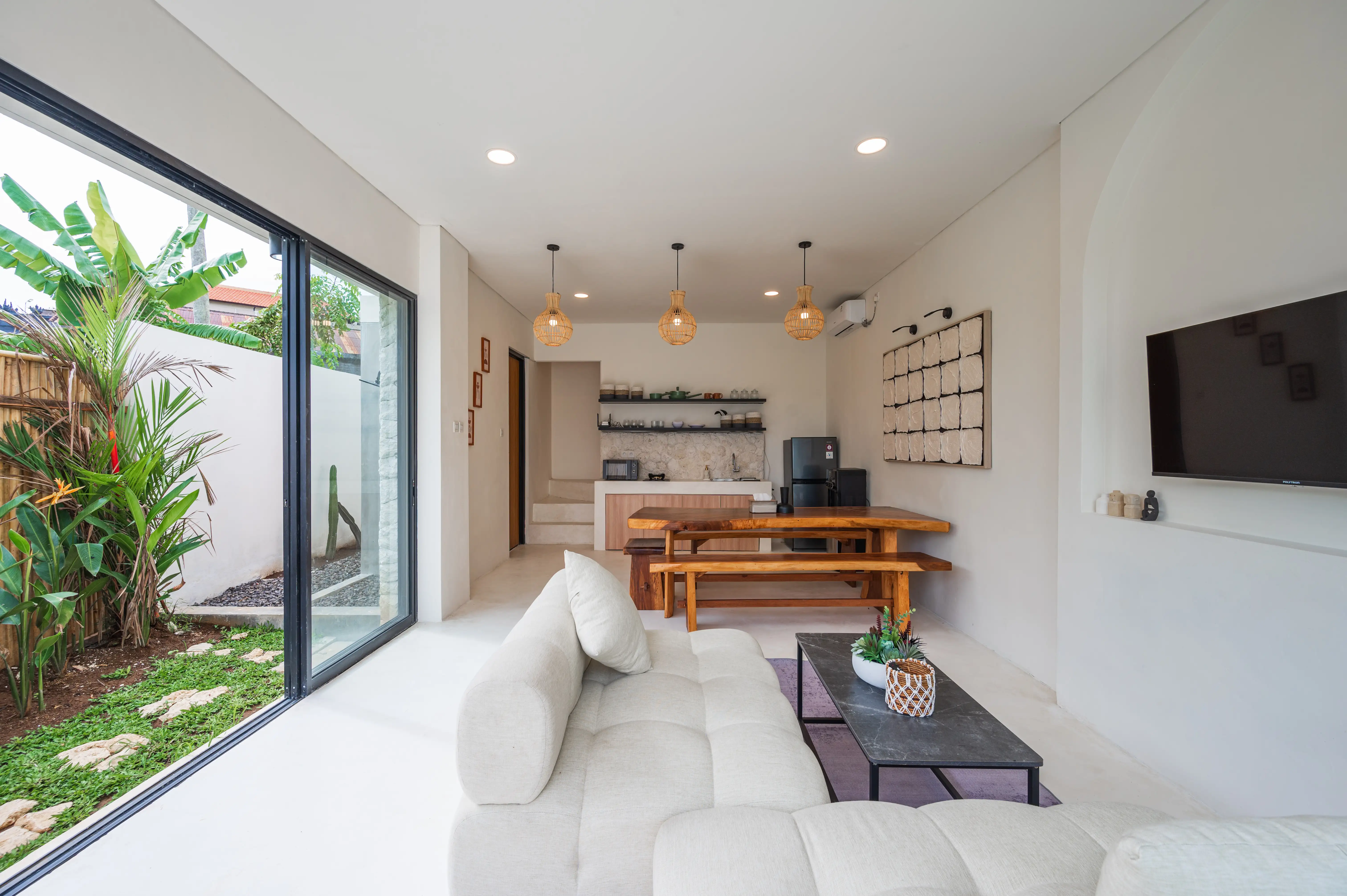 Откройте для себя воплощение современной жизни с этой потрясающей виллой с одной спальней + офисным пространством, расположенным в спокойном районе Бабакан, всего в 10 минутах езды от знаменитого пляжа Бату-Болонг. Эта вилла сочетает в себе современный дизайн с тропическим очарованием, создавая гармоничное жилое пространство, идеально подходящее для отдыха и развлечений. Гладкий архитектура имеет обширные стеклянные двери, которые открываются к частному бассейну, позволяя естественному свету затопить интерьер, обеспечивая бесшовный опыт жизни в помещении. Кроме того, на вилле открывается захватывающий вид на окружающие террасы с рисовым рисом, укрепляя спокойную атмосферу. Жилая зона с открытой планировкой украшена стильной мебелью, в том числе удобными сидениями, шикарными осветительными приборами и вкусным декором, что делает ее привлекательным местом для семейных встреч или интимных вечеров.