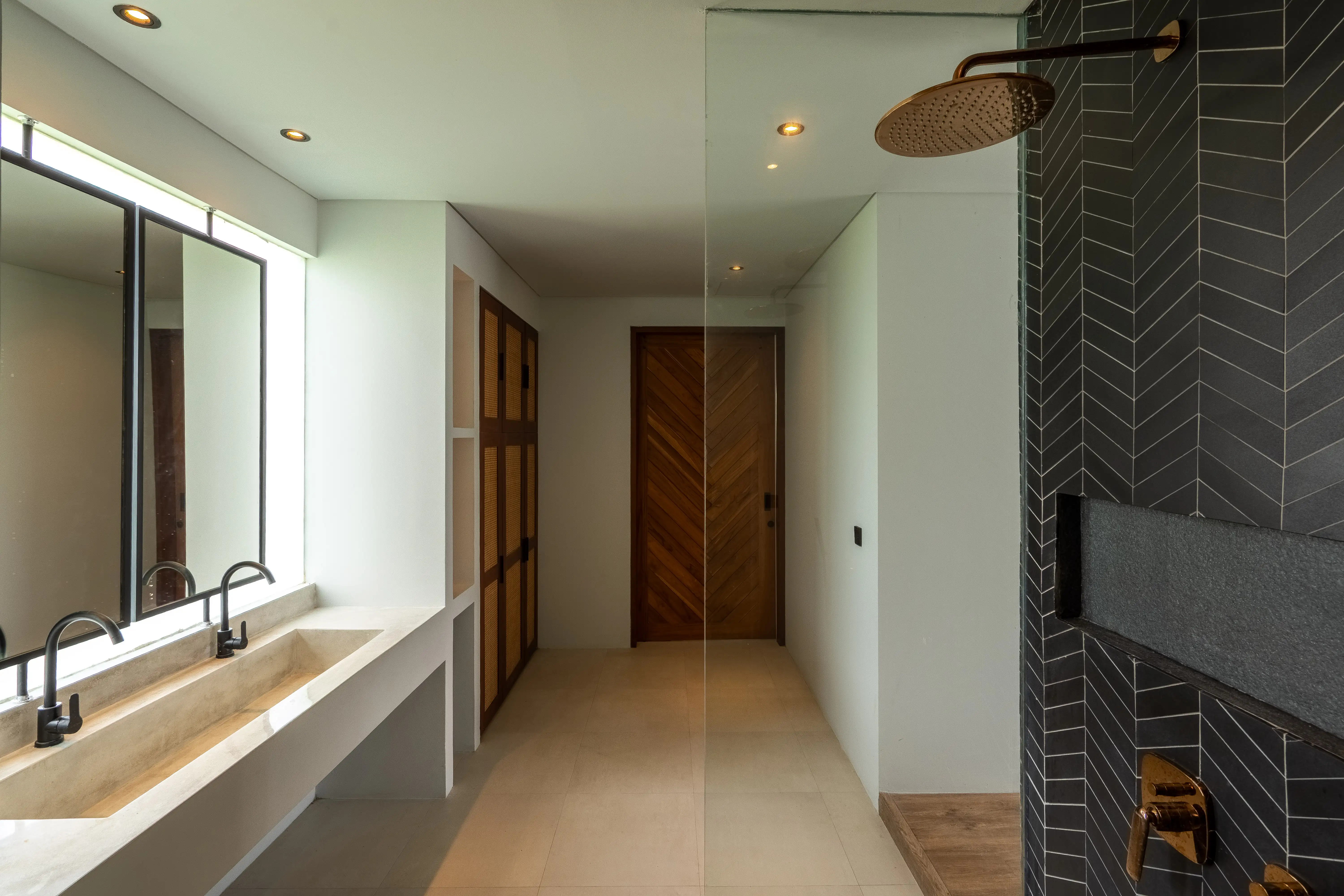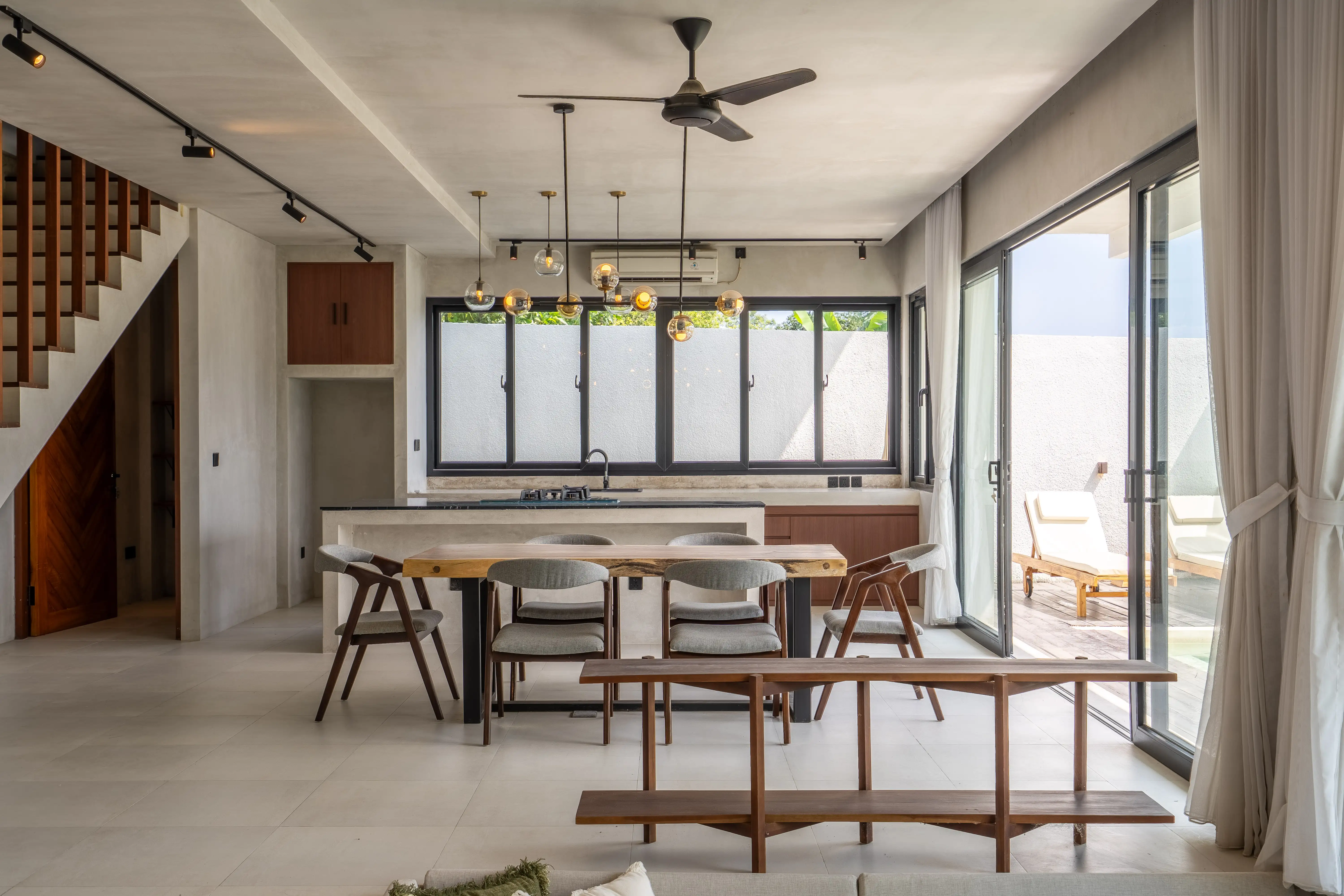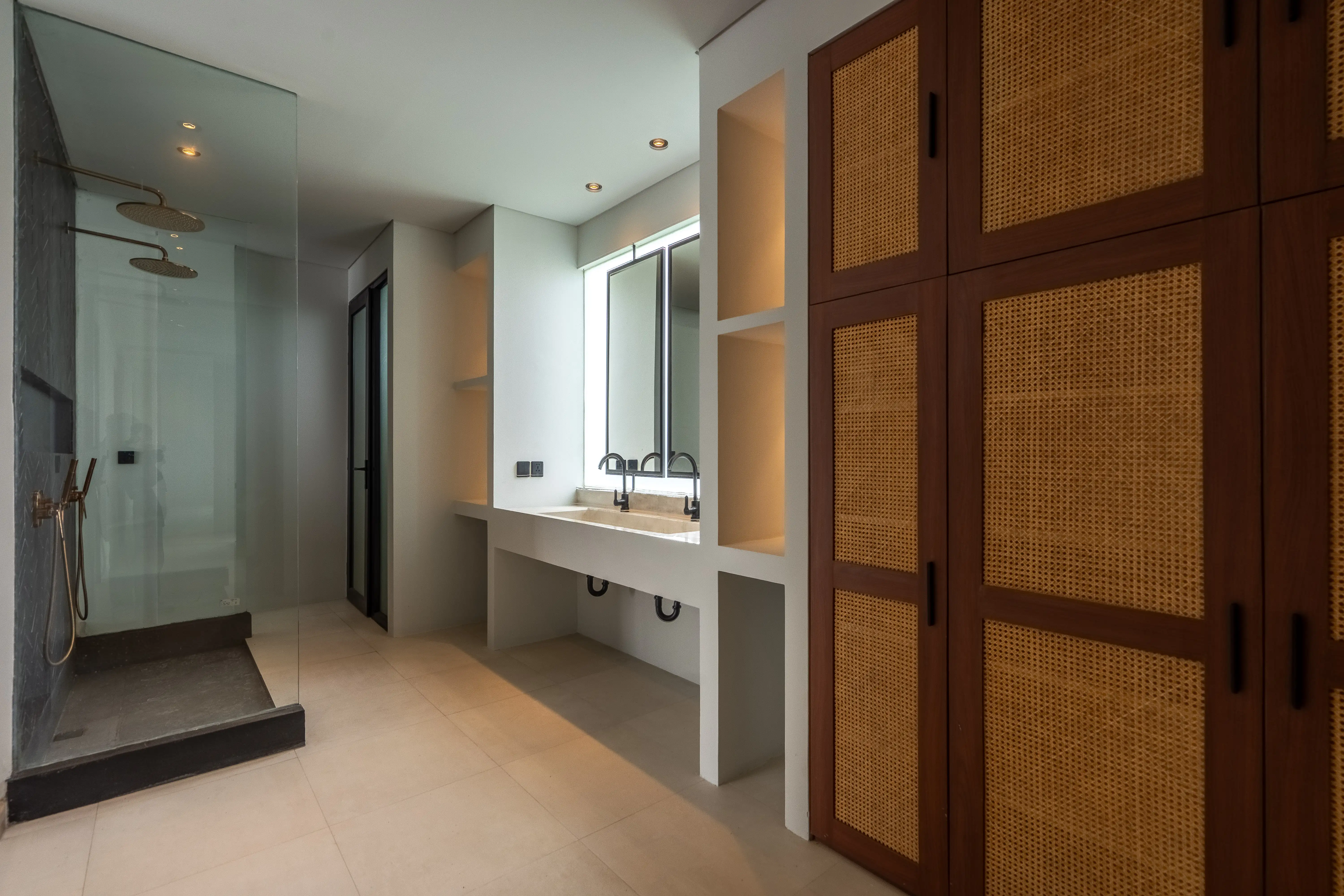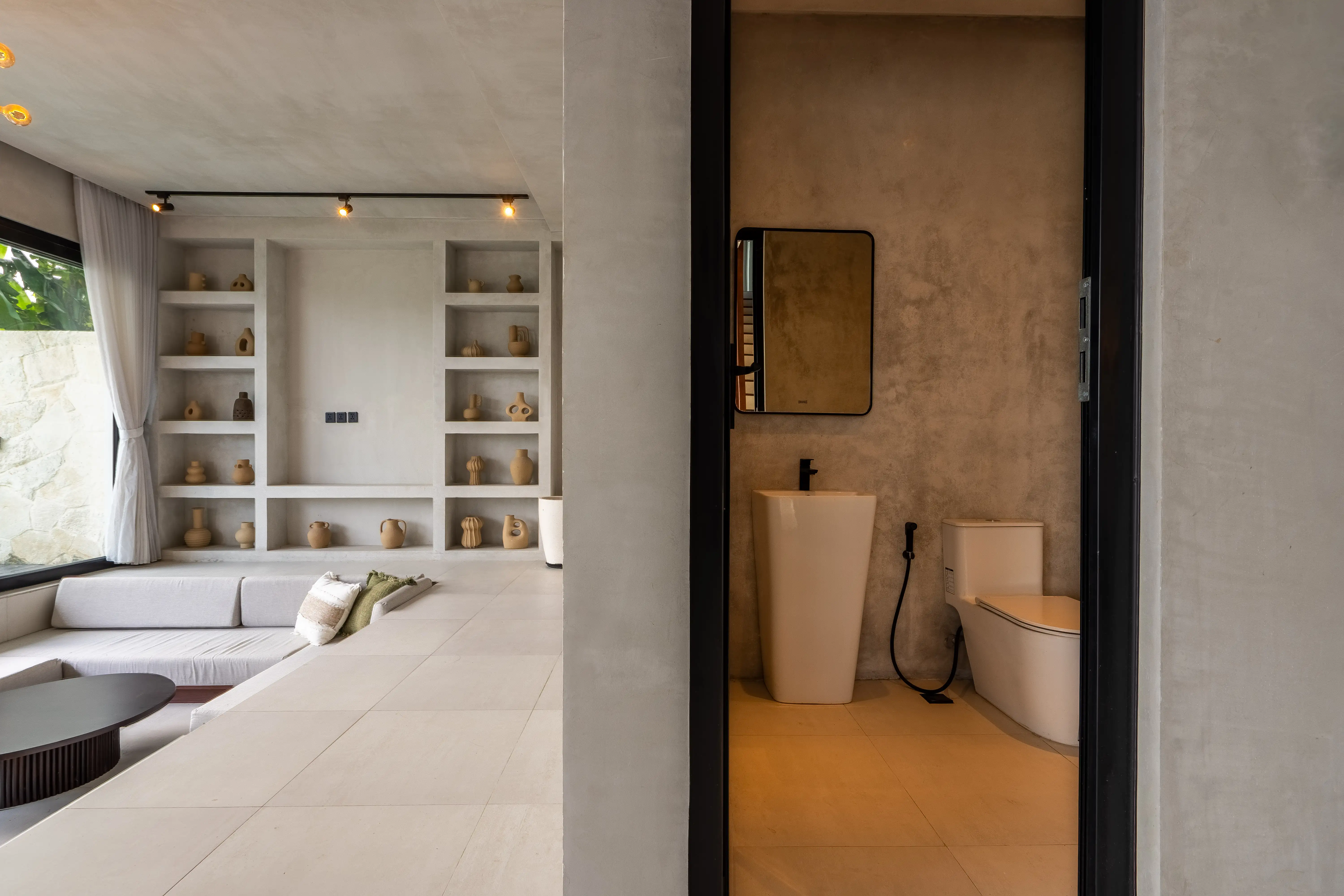 Освещение над островом сочетает элегантность с функциональностью, в то время как открытая планировка поддерживает плавный поток между кухней, столовой и гостиной. Вилла включает в себя три спальни, каждая из которых предназначена для обеспечения комфорта и конфиденциальности. Мягкие нейтральные тона создают успокаивающую среду, в то время как такие детали, как утопленные стеллажи, настенное освещение и премиальная отделка, усиливают современное ощущение. Ванная комната оснащена современной отдельно стоящей раковиной, настенным зеркалом и туалетом, сохраняя минималистскую тему. Умное использование пространства по всей вилле обеспечивает функциональность без ущерба для стиля.