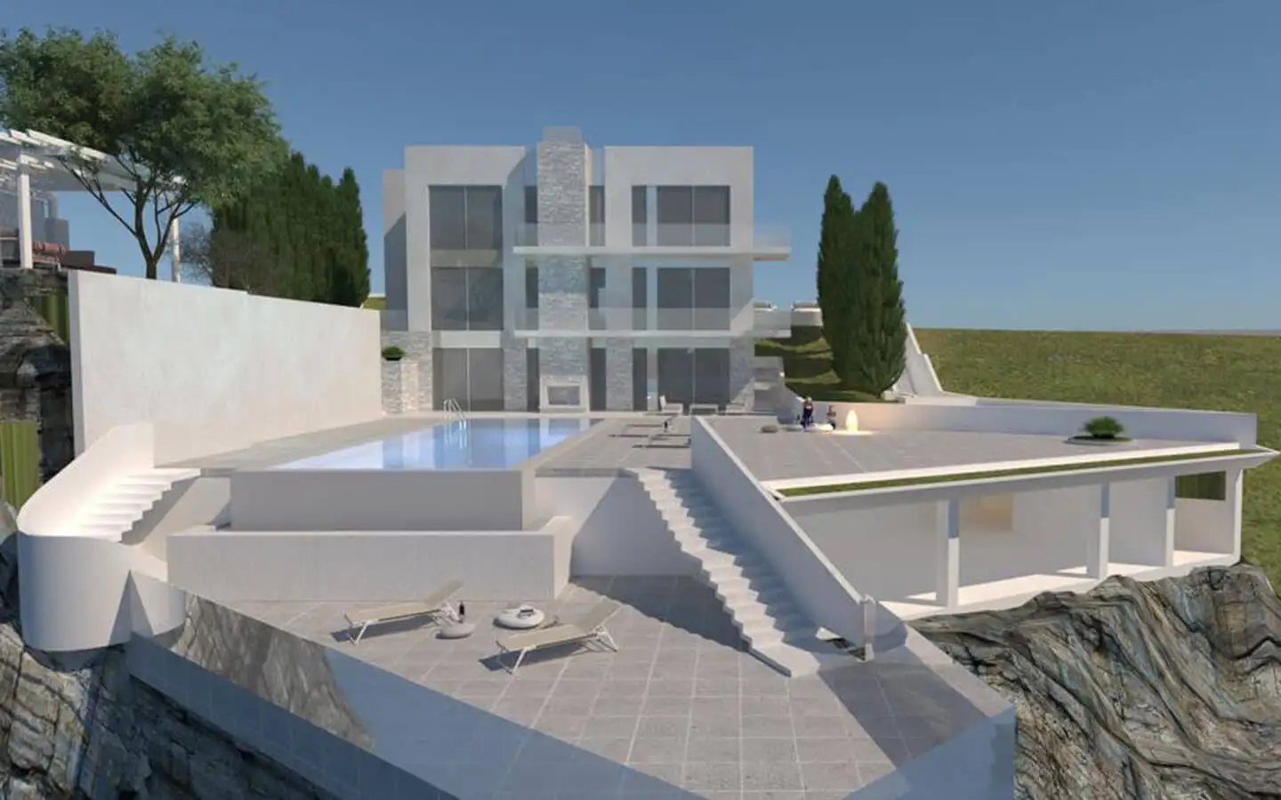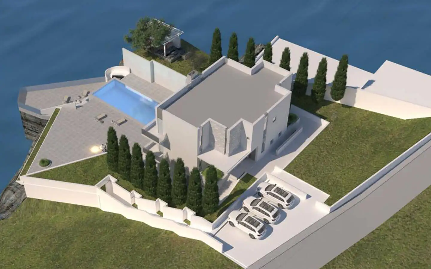 Перед виллой есть бассейн с панорамой открытого моря, зоной для принятия солнечных ванн, крытой перголой / затененным пространством для отдыха и ландшафтным окружением, идеально подходящим для отдыха и развлечений. Частная парковка для трех транспортных средств расположена у входа.