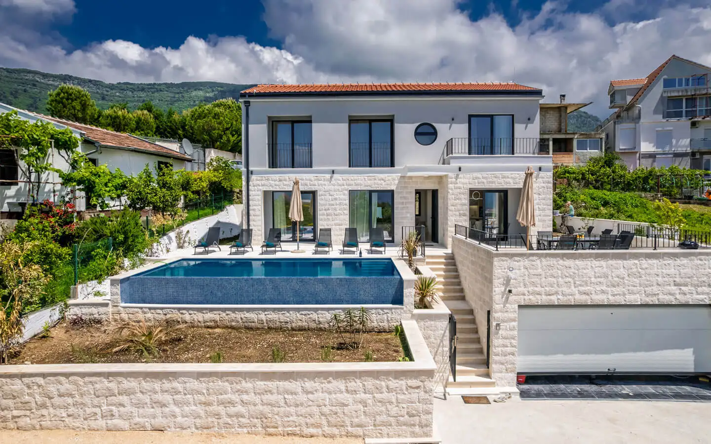 Эта недавно построенная современная вилла с бассейном и захватывающими панорамными видами расположена в тихом жилом районе Мрцевач, Тиват, всего в нескольких минутах от аэропорта и оживленного прибрежного центра. Расположенный на мягко приподнятом участке, объект имеет постоянный, беспрепятственный вид на море над заливом Тиват благодаря естественному склону местности. Вилла продуманно спроектирована для обеспечения комфорта, конфиденциальности и бесшовной жизни в помещении.