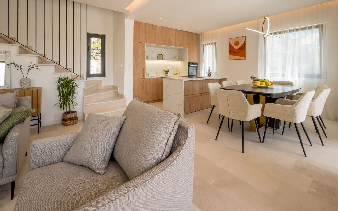 Построенная из высококачественных материалов и современных строительных стандартов, вилла полностью обставлена мебелью ручной работы и оснащена всеми необходимыми приборами, что делает ее полностью готовой. Ключевые особенности включают в себя: напольное отопление по всей вилле, центральную котельную систему, кондиционирование воздуха, бесконечный бассейн, благоустроенный внутренний двор и сад, гараж на 2 автомобиля +